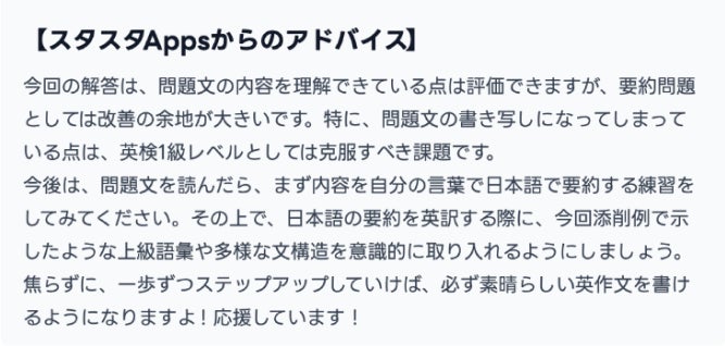 スタディスタジオ株式会社(本社:東京都渋谷区、代表取締役 鈴木孝一、以下「当社」)は、英検®受験生向けのウェブサービス「スタスタApps」において要約問題(Summary)のAI採点機能を大幅に改修いたしました。以前はCSEスコア算出などの合否判定をサポートする目的がメインでしたが、今回のアップデートによって、要約力そのものを伸ばすための学習ツールへと進化。実際に短期合格者を多数輩出しているオンライン英検専門塾「スタスタLIVE英検」が有するノウハウをふんだんに組み込み、受験生が書き癖や文法ミスを効果的に修正しながらスキルアップできる仕掛けを整えました。