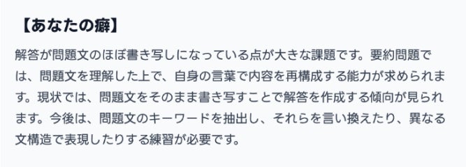 要約問題は慣れが大切とはいえ、闇雲に数をこなすだけでは伸び悩むケースが多いです。今回のAI添削では、書き癖・語彙・文法・接続詞の使い方などを網羅的に指摘するため、効率良く学習が進められ、短期間で合格レベルに到達しやすくなります。