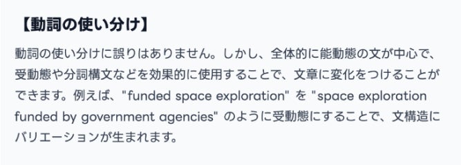 • 改修内容: 今回の要約用添削にも、自動詞・他動詞の使い分け指摘を反映。何気なく使った動詞が目的語を伴えない(あるいは必要)動詞だった場合、AIが具体例とともに修正提案を行い、文法精度を高めます。