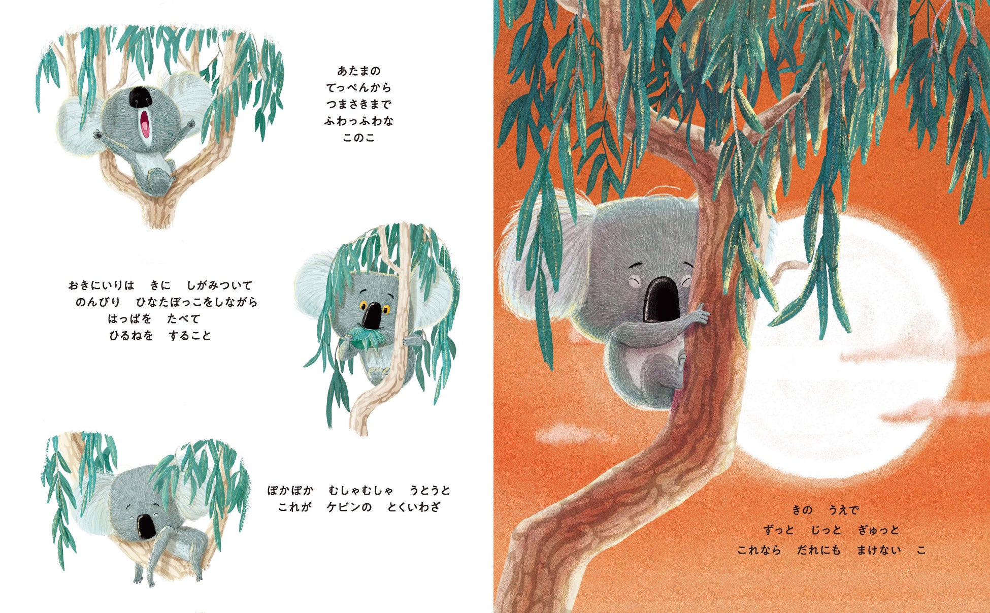 コアラのケビンはのんびり屋。毎日が同じで安全な場所が好き。いつもいる木の上にぎゅっとしがみついて、みんなの誘いにものりません。そんなケビンに思いもよらない出来事が訪れます。変化を受け入れたケビンにはどんな時間が待っているのでしょうか。