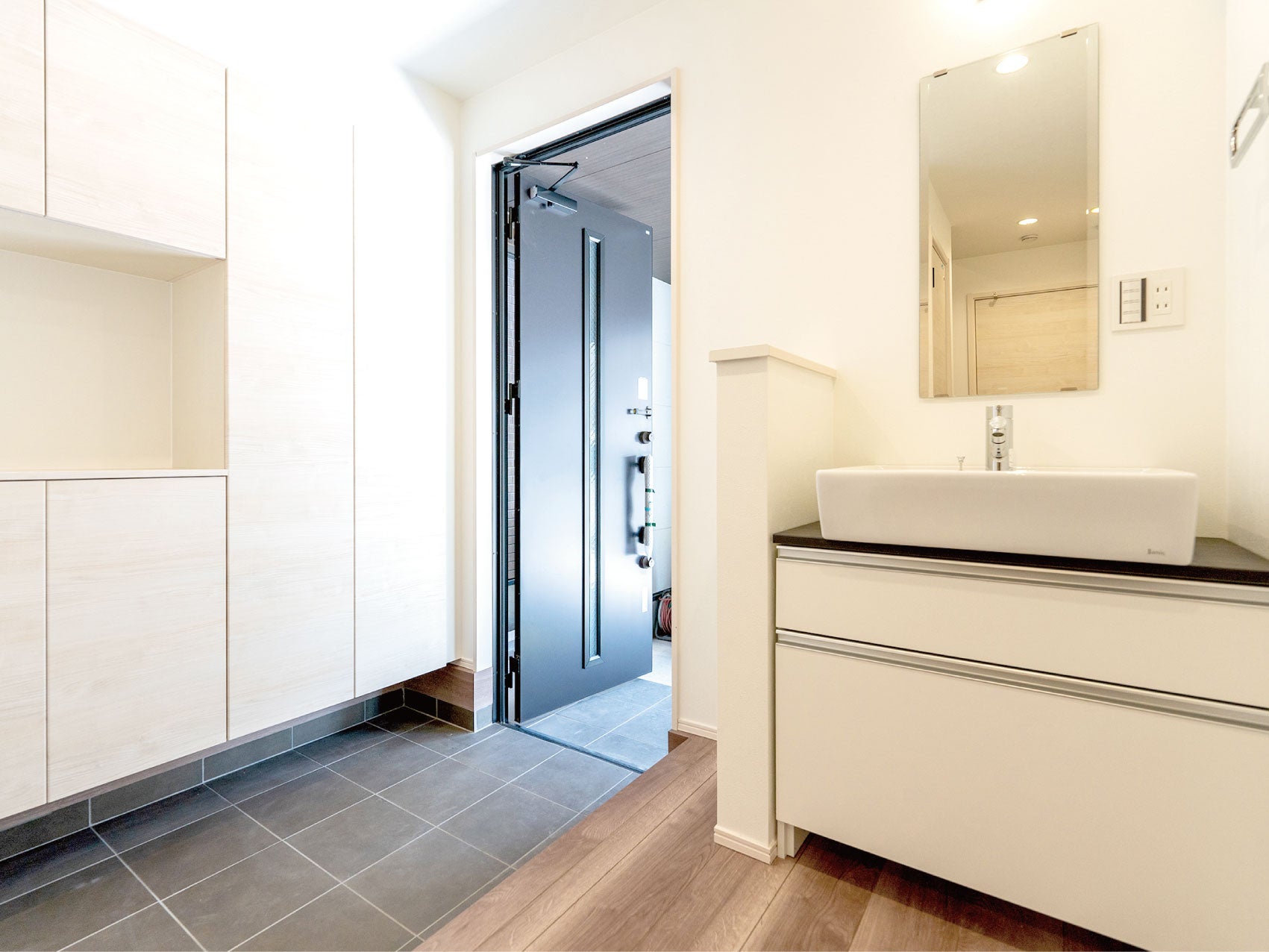 『帰ったらすぐ手洗い』の習慣づけに役立つ、玄関を入ってすぐの場所に設けた手洗い洗面台。「手は洗ったの!?」なんて言う機会が減れば、パパやママはもちろん、お子さまだって嬉しいですよね。コンセント付きなので、洗面脱衣室の洗面台をメインに、混み合うことの多い朝などにはこちらをサブ洗面としてもお使いいただけます。
