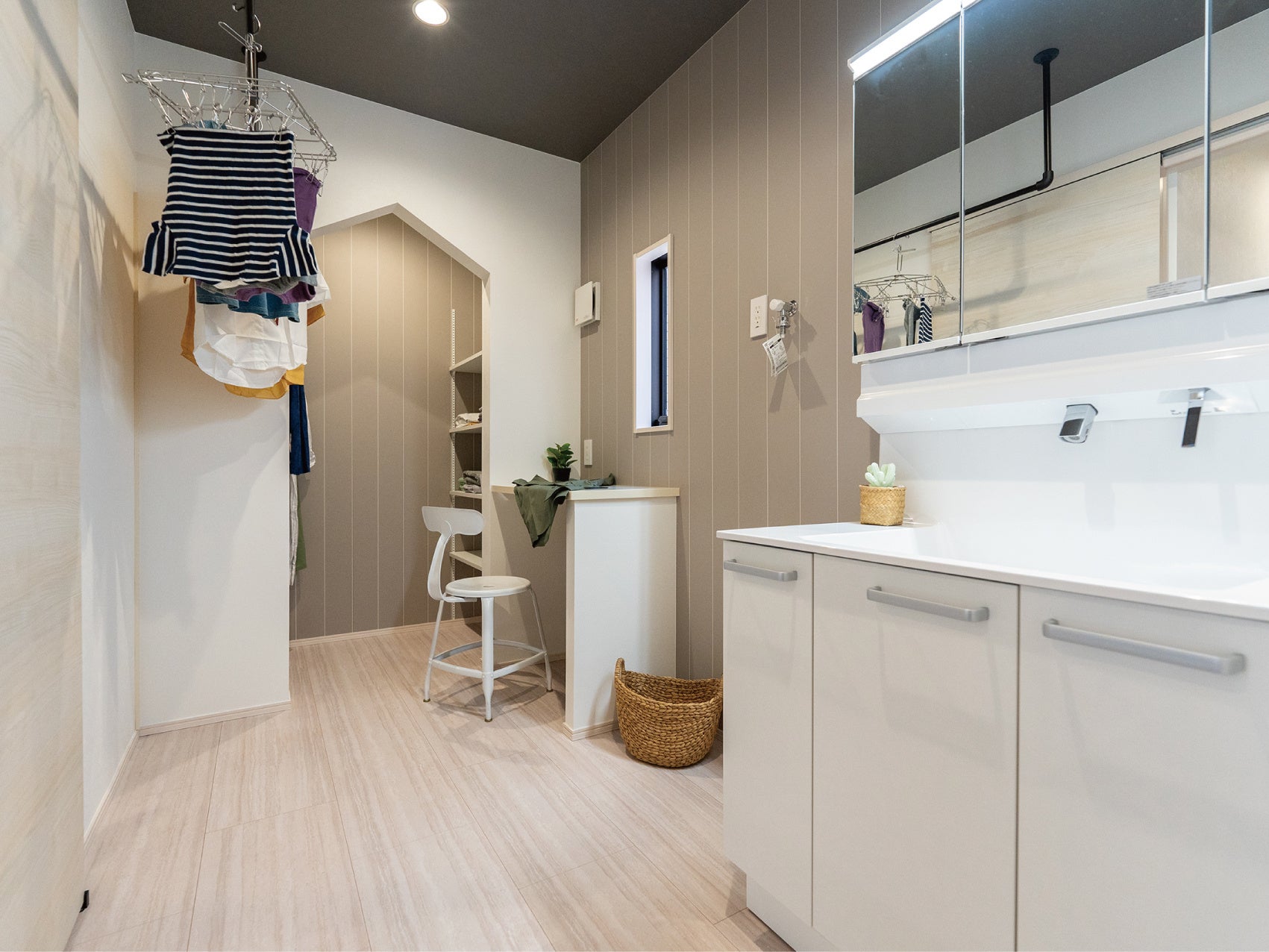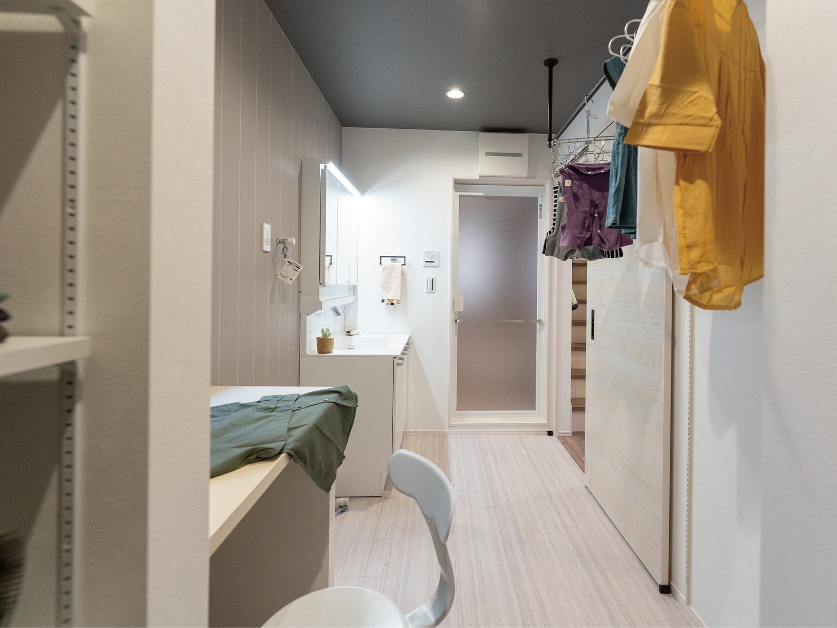 洗う→干す→たたむが一カ所で完結するだけでなく、併設しているクローゼットへと洗濯物をハンガーにかけたまましまえる進化版のラク家事ランドリー。ハウセットの自信作です。