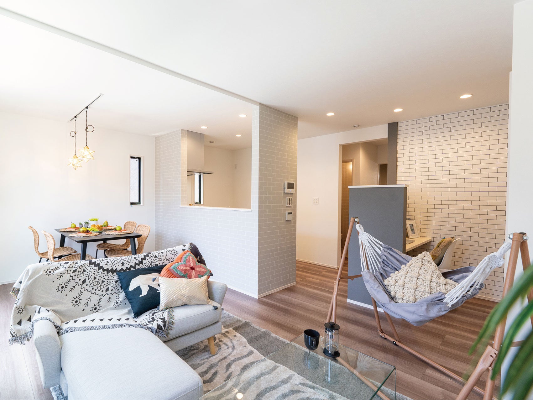 ラタン素材やライトグレーカラーのナチュラルな家具にオレンジの差し色を組み合わせてコーディネートしています。トラが特徴的なリビングのカーペットや星型のペンダントライトなど一癖ありつつも馴染みやすいものを揃えました!費用はもちろん、既にコーディネートされているものなのでサイズを気にしなくて良いのも嬉しいポイントです。