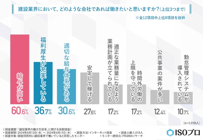 建設業界で働きたいと思う会社は「高い給与」「充実した福利厚生」「適切な給与体系」