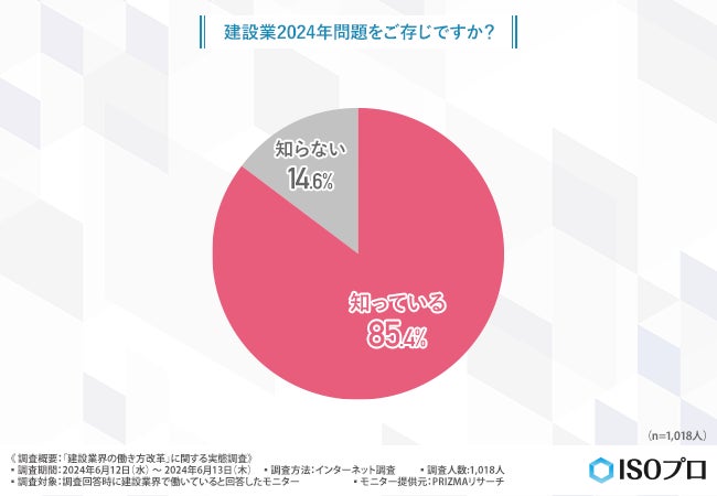 「建設業2024年問題をご存じですか?」と質問したところ、8割以上の方が『知っている(85.4%)』と回答しました。