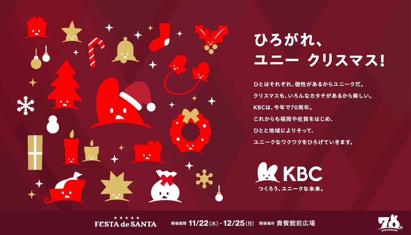 KBC九州朝日放送は“地域のユニークさをさらに伸張させたい”という思いを込めて、創立70周年記念事業 「KBC 70th Anniversary FESTA de SANTA」を開催します(企画・運営:株式会社Mr.Weihnachtsmann)。このイベントは「世界で一番サンタに出会える場所」をテーマにしており、会場となる貴賓館前広場では、100体を越えるサンタ像が来場者を出迎えます。ユニークなクリスマス空間を通して、福岡に新しい冬の楽しみを提供し、この街の未来がさらにユニークになることを願っています。