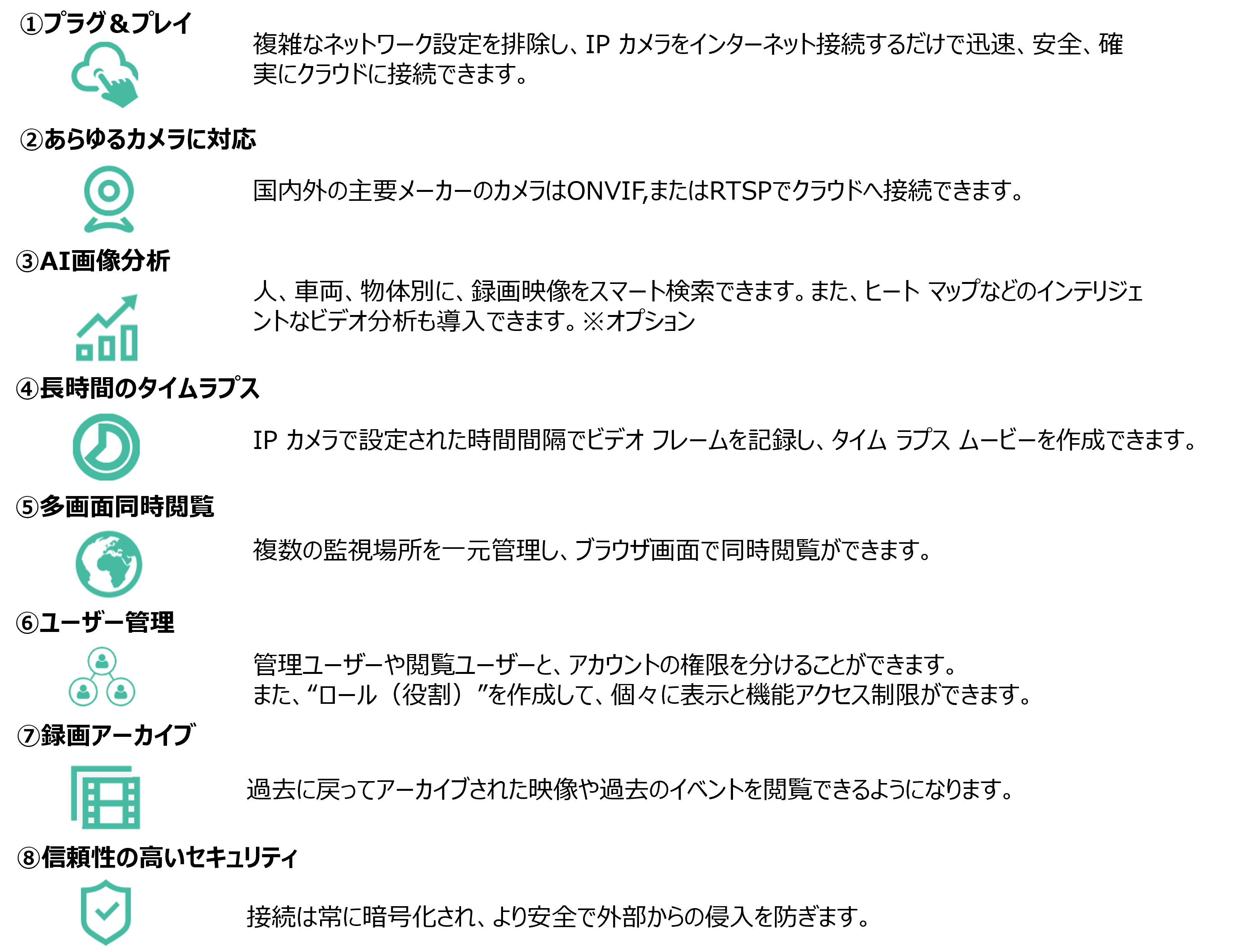 本システムでは、パナソニック、アクシス、キヤノンなど国内外あらゆるメーカーのカメラをクラウドに接続可能です。プラグ&プレイカメラは、ポート転送を介してカメラをインターネットに公開する必要がないため、セキュリティ面においても、非常に信頼性の高い構成となっています。
