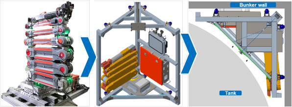 Vinçotte社は、ロボティクス分野におけるパートナーであるハイボットが開発した多目的非破壊検査用の多関節ロボットアーム、Float Armを活用することが最も有効であると考えました。今回のミッションのためにFloat Armには放射能汚染対策が施され、適切なセンサ・ペイロードが装備されました。そして深いバンカーの最も狭いコーナーエリアに施設備え付けの天井クレーンを使って侵入できるよう、新たに開発された専用ケージも装備されました。このような対策をすることにより、人や他の検査装置では近づくことができなかった環境においても点検が可能となりました。