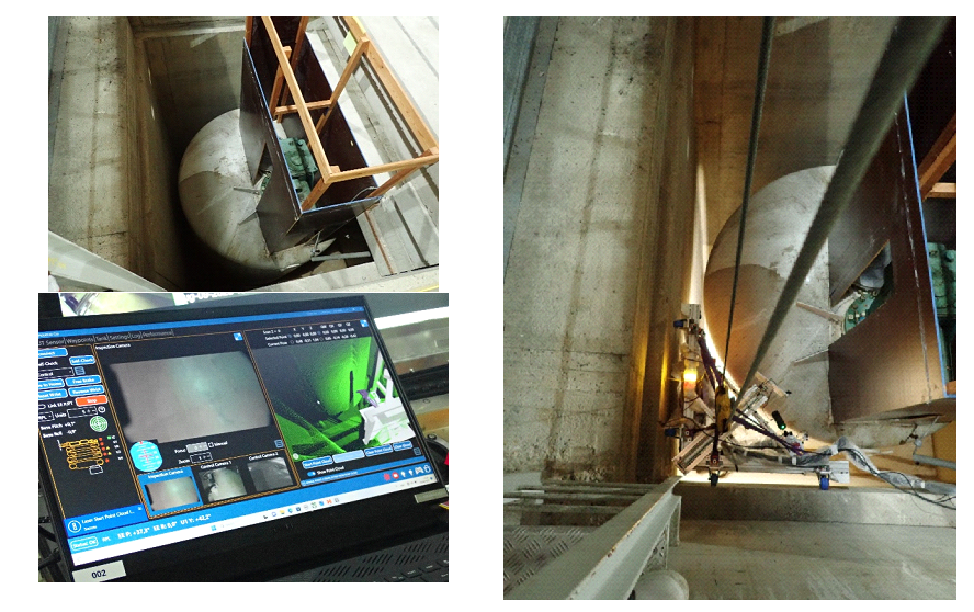 貯蔵タンクの大半はステンレススチール製であるためマグネット式クローラロボットは使用できず、吸引式クローラロボットやUAV(ドローン)は汚染リスクが高いため不向きと判断されました。加えて、タンク周辺の作業スペースが狭いため、足場を設置することも現実的ではありませんでした。