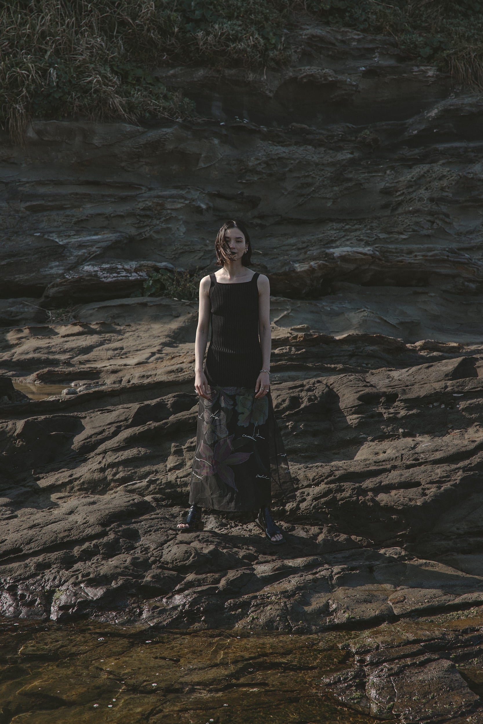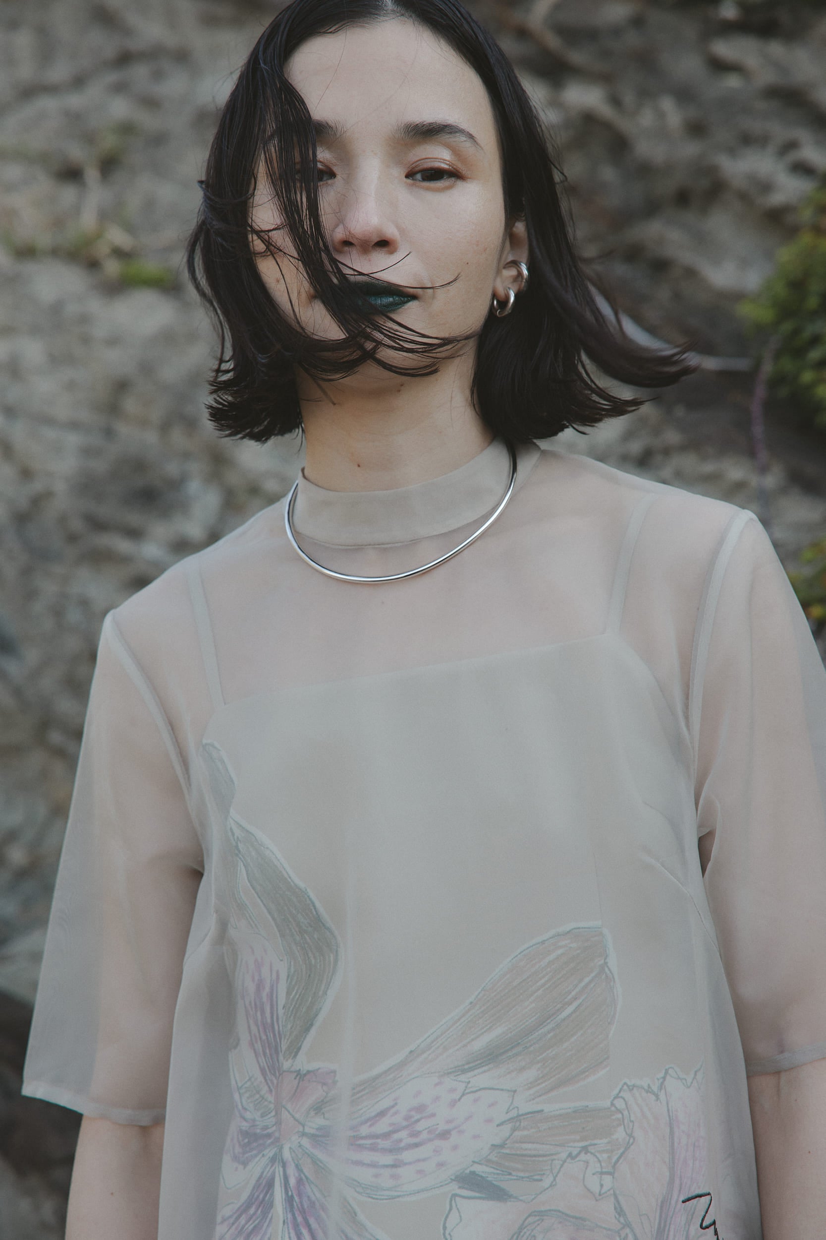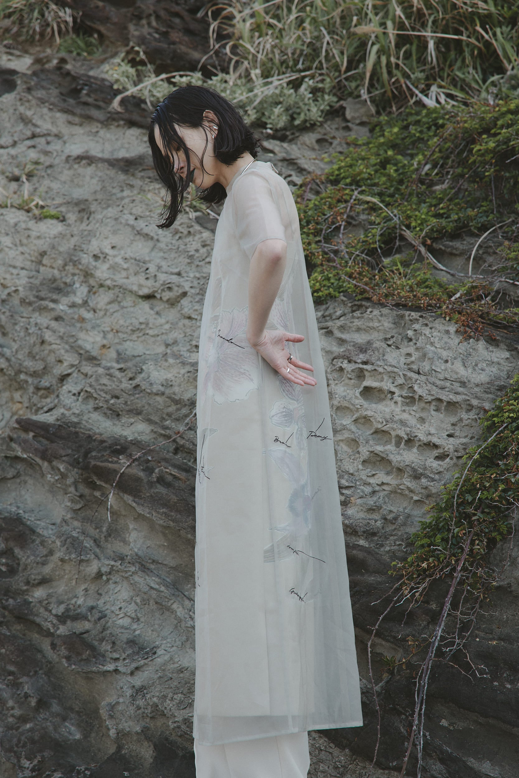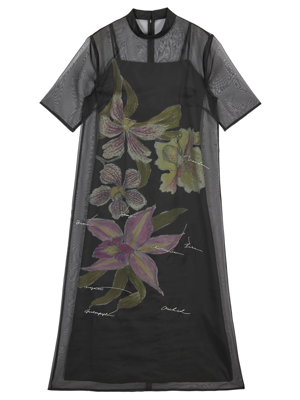 ケイタマルヤマの制作過程のラフ画をピックアップし、ドレスに落とし込んだアイテムです。鮮やかで目を惹く花柄を大胆にプリントしつつ、品のあるややフレアシルエットのドレスに仕上げた一着。原画のトレーシングペーパーに書かれた文字はオーガンジーに刺繍を施しています。刺繍を入れたオーガンジーのドレスとケイタマルヤマのオリジナル柄をプリントしたキャミドレスのセットです。キャミドレスはリバーシブルで表が花柄と裏が無地でそれぞれのデザインを楽しめます。