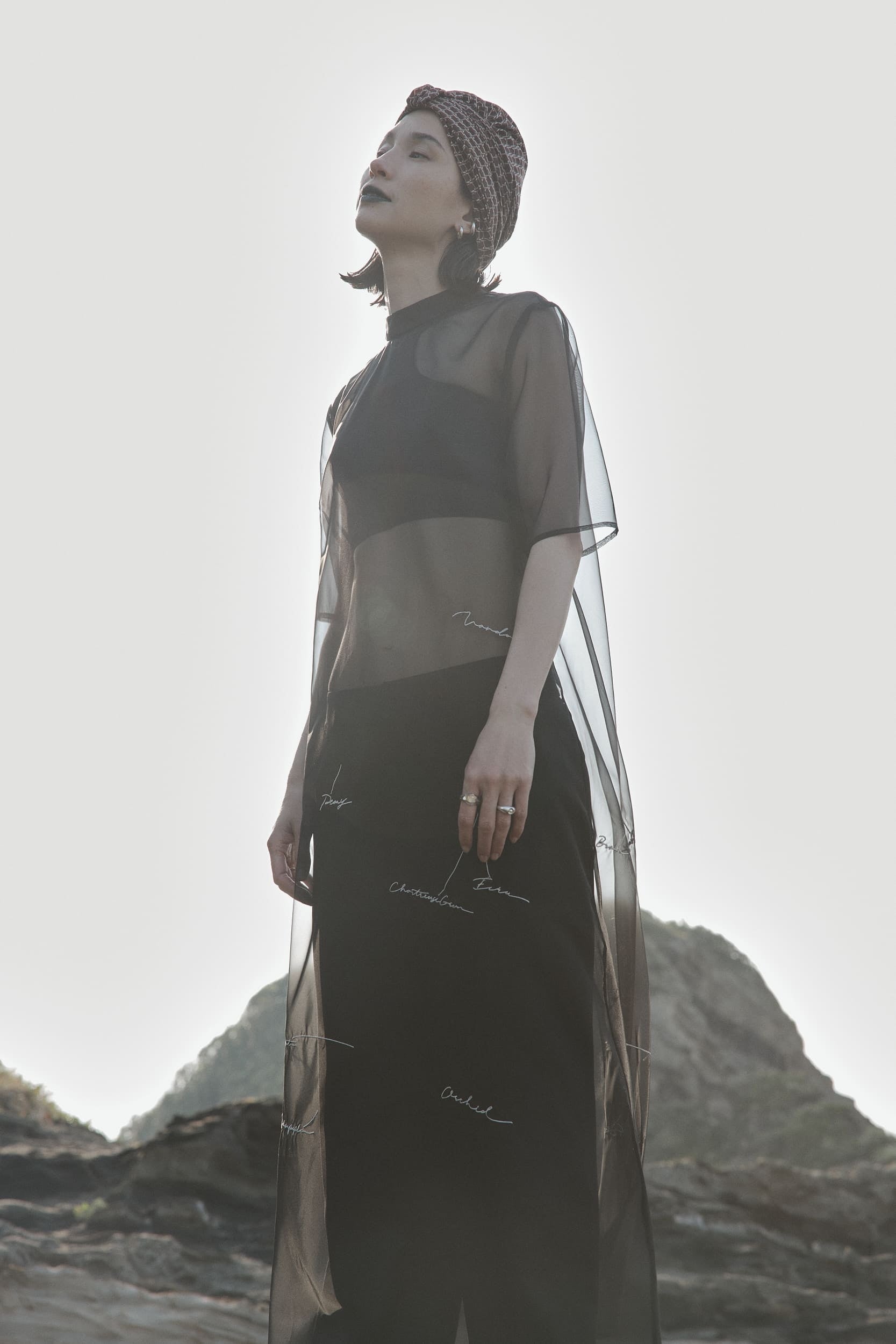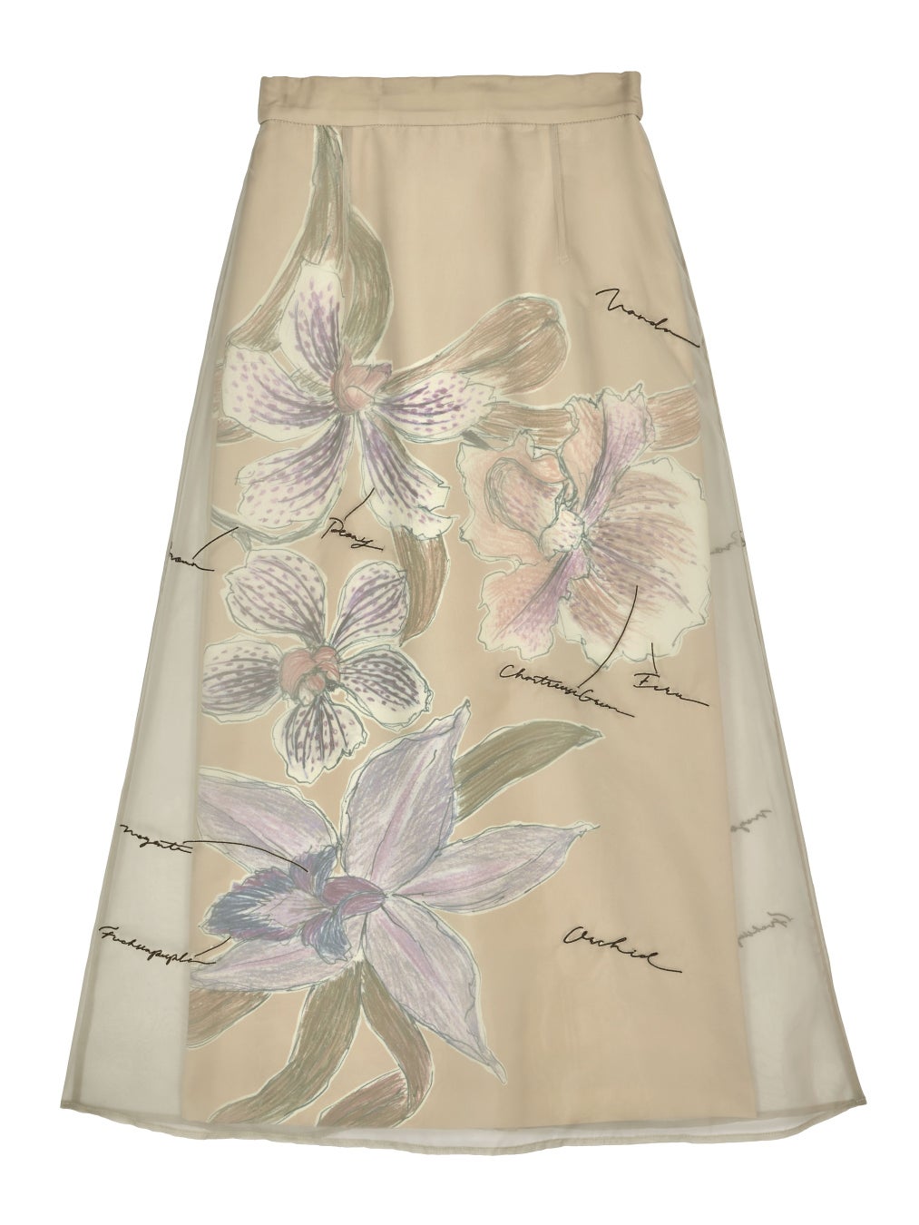 ケイタマルヤマの制作過程のラフ画をピックアップし、スカートに落とし込んだアイテムです。鮮やかで目を惹く花柄を大胆にスカートにプリントし、オーガンジーをレイヤードした奥行のあるトラペーズラインのスカートです。原画のトレーシングペーパーに書かれた文字はオーガンジーに刺繍を施し表現しています。