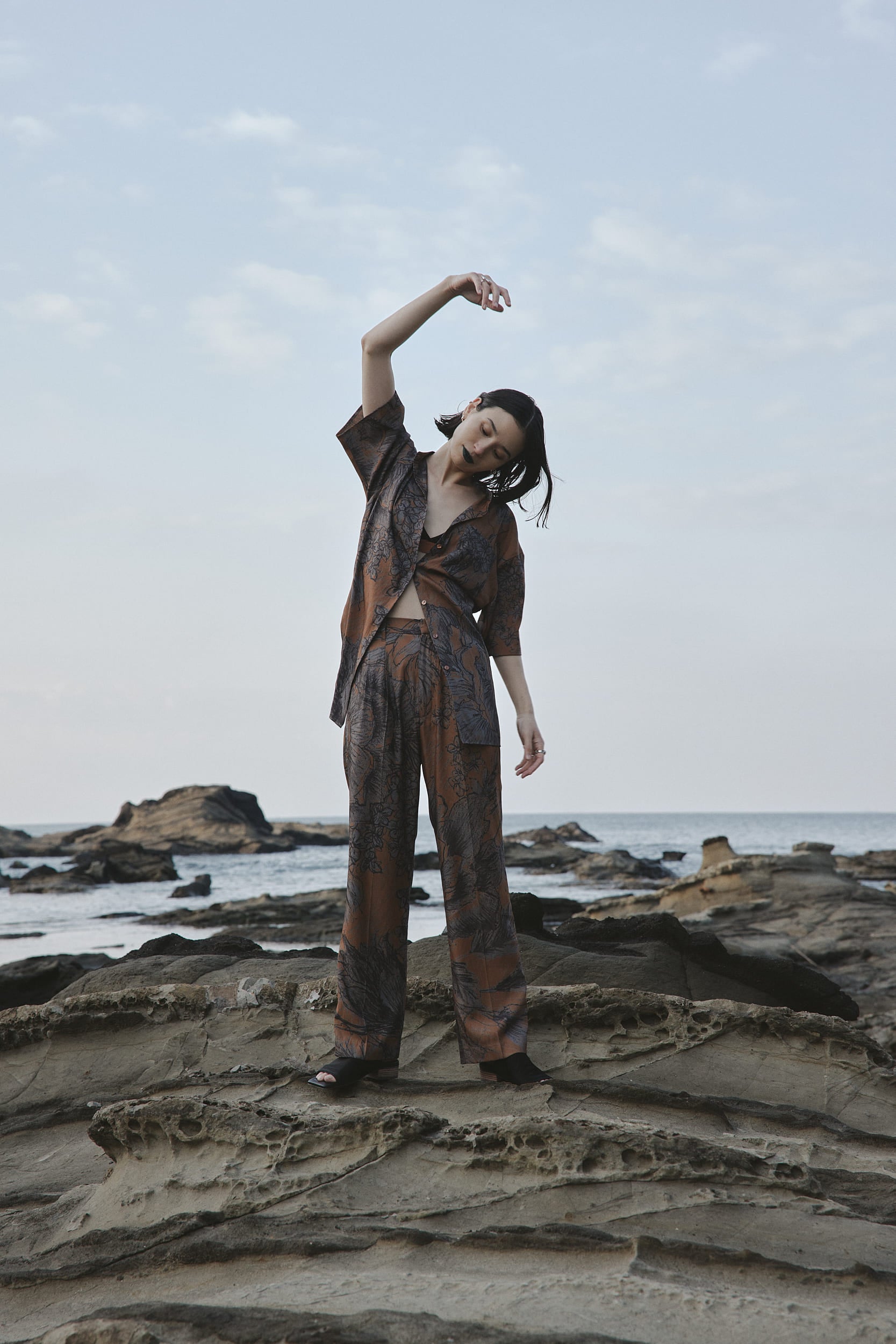 ケイタマルヤマの迫力のある鉛筆画を大胆に、大柄にしてはめ込んだパンツです。シルエットはストレートで、センタープレスを施すことで美脚見えするように。ペーパータッチなポリエステル素材なのでシワになりにくいのもポイント。