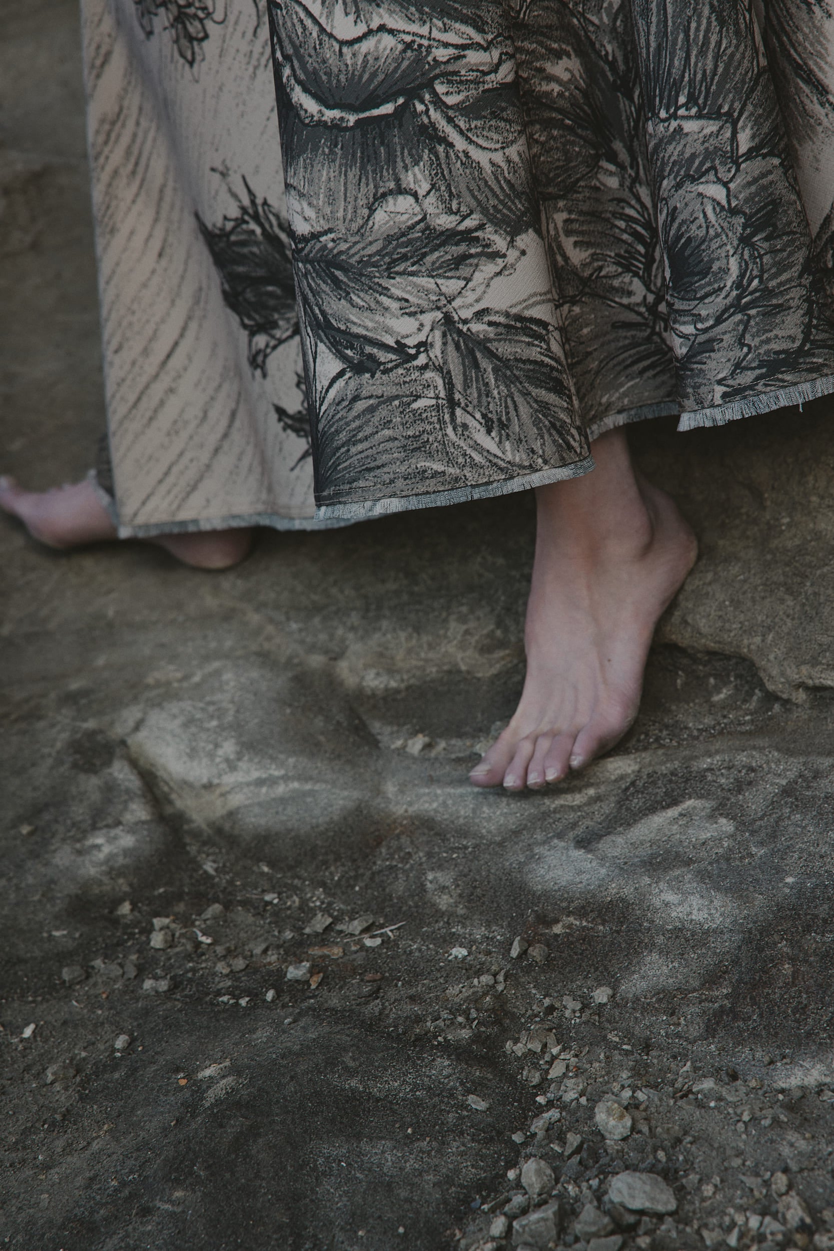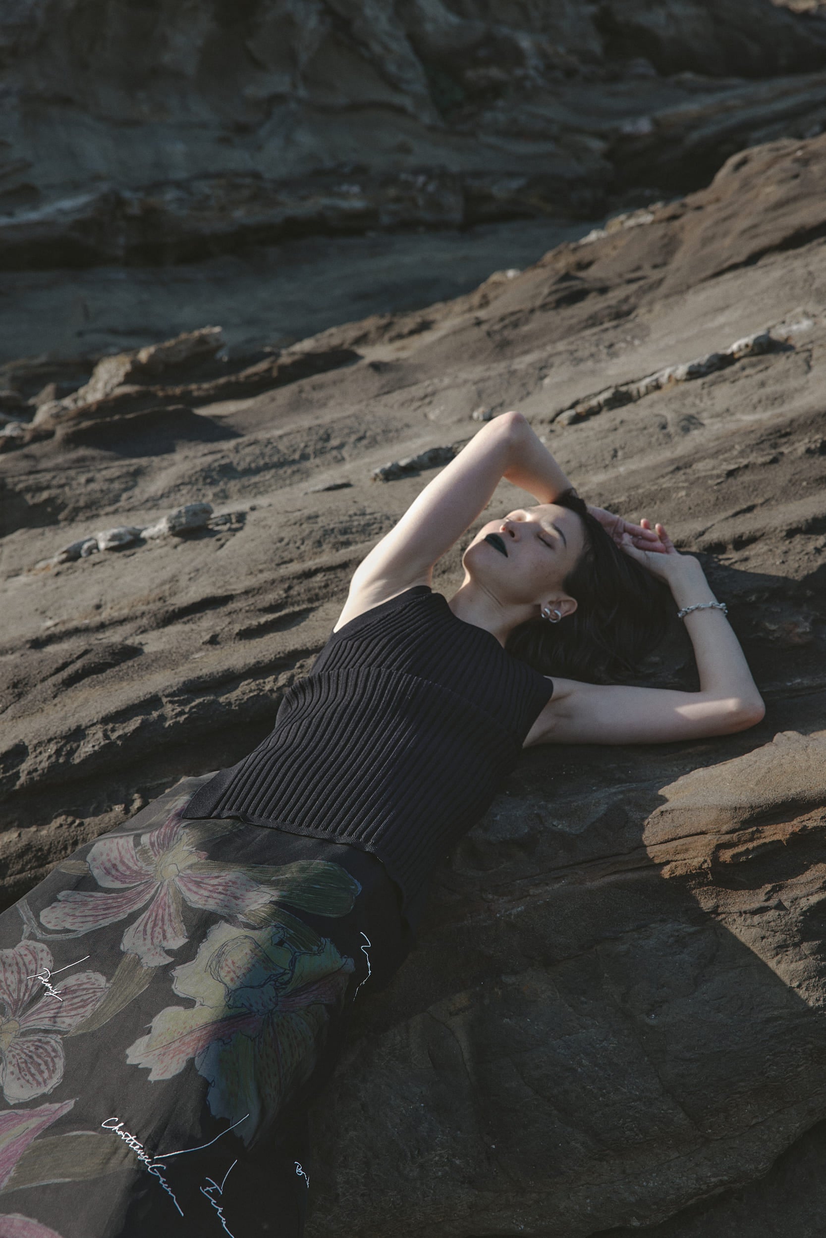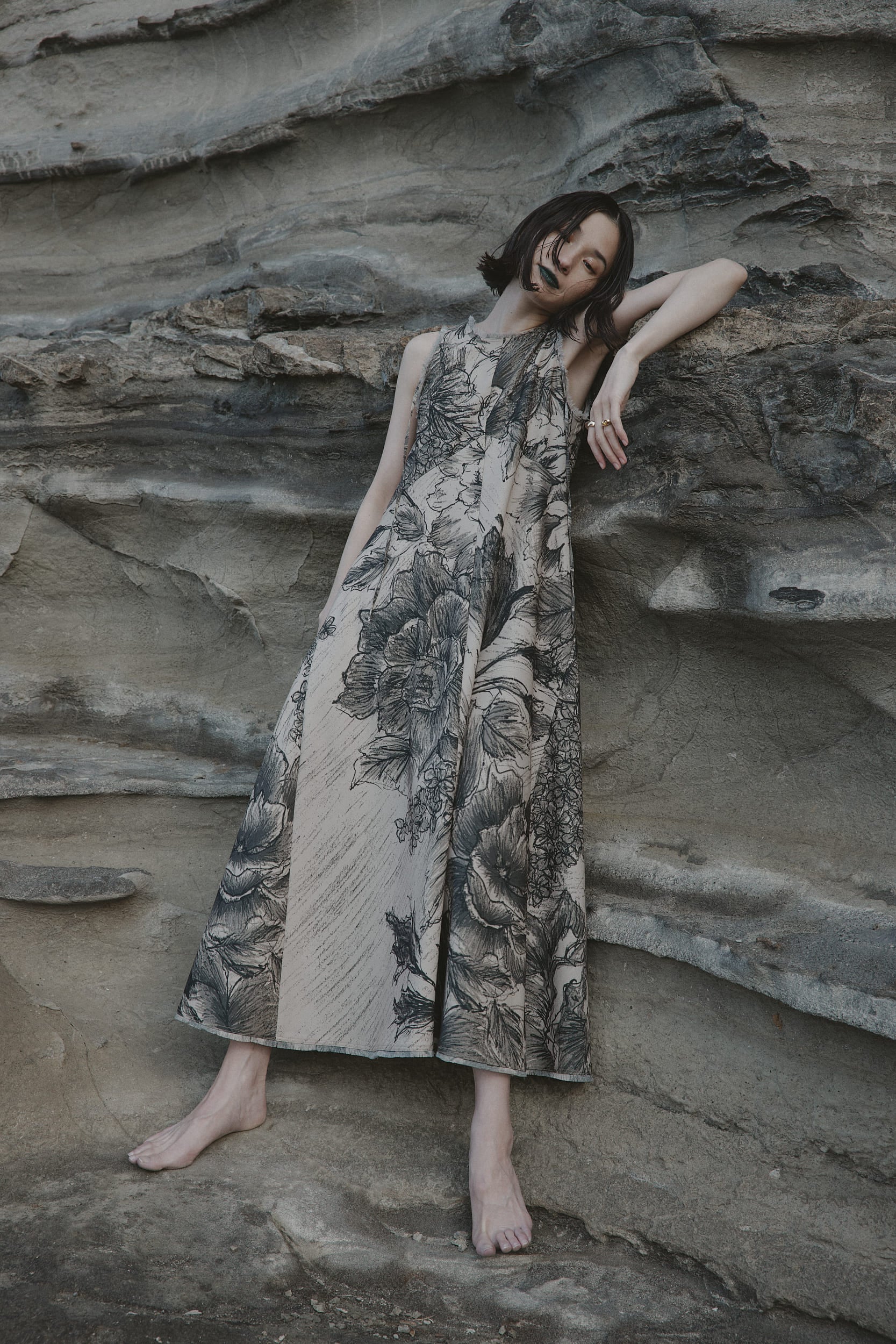 ケイタマルヤマの迫力のある鉛筆画を大胆に、大柄にしてはめ込んだドレスです。裾にかけて分量をたっぷり取った為、身頃はアメリカンスリーブですっきりとしたシルエットにしています。