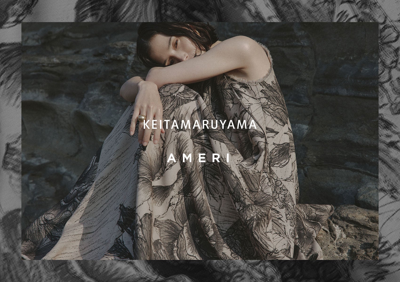 アイテムに使用した「KEITAMARUYAMA」のアーカイブテキスタイルは完成された柄ではなく、鉛筆で描いた下書きの花柄や、丸山敬太氏の直筆のコメントが描かれた制作途中のラフ画を使用しています。敢えて制作途中のラフ画を使用することで、他コラボにはない「AMERI」らしい独創的なアイテムに仕上がりました。「KEITAMARUYAMA」の華やかで優美な世界観と新しい価値を生み出す「AMERI」との特別なコラボレーションをお楽しみください。