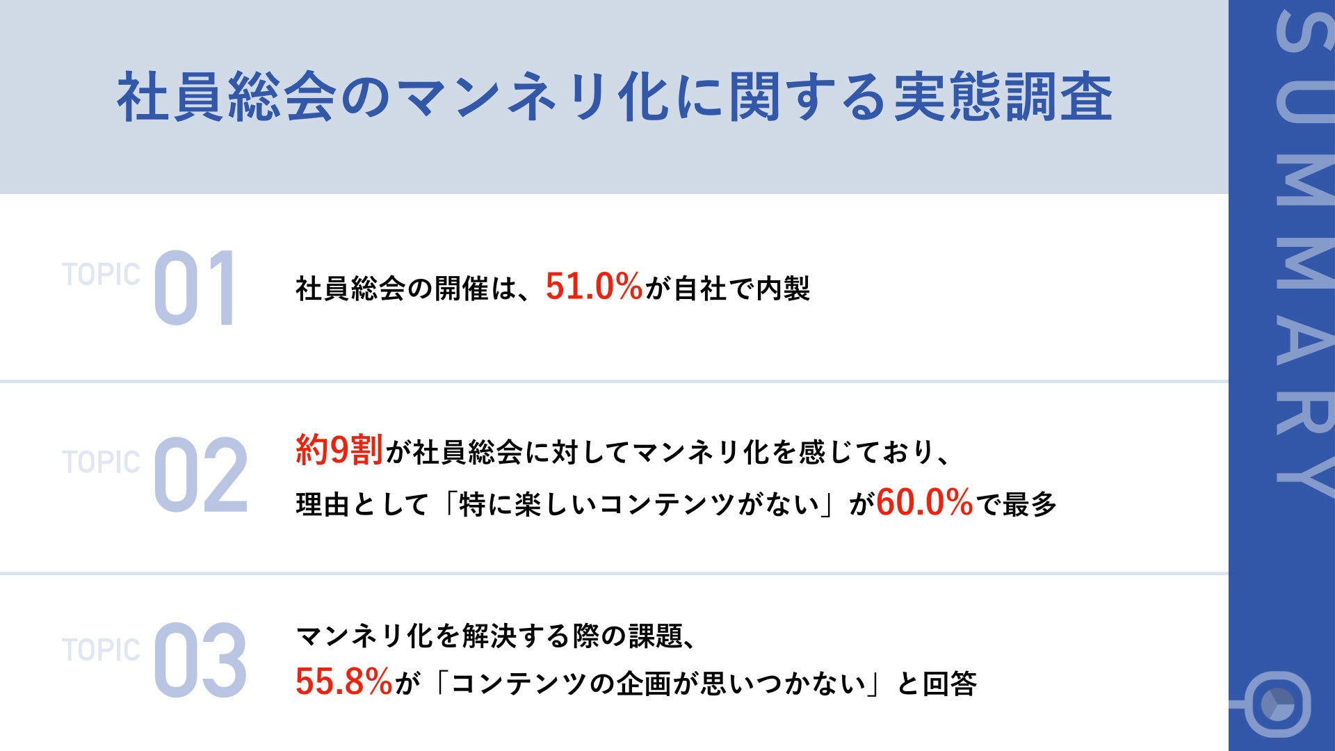 社員総会の開催は、51.0%が自社で内製していることが分かりました。また、社員総会を開く背景として、主に「生産性」「モチベーション」「ロイヤリティ」の向上と回答しており、63.9%が実際に社員総会を開くことで目的を達成していると回答しました。
