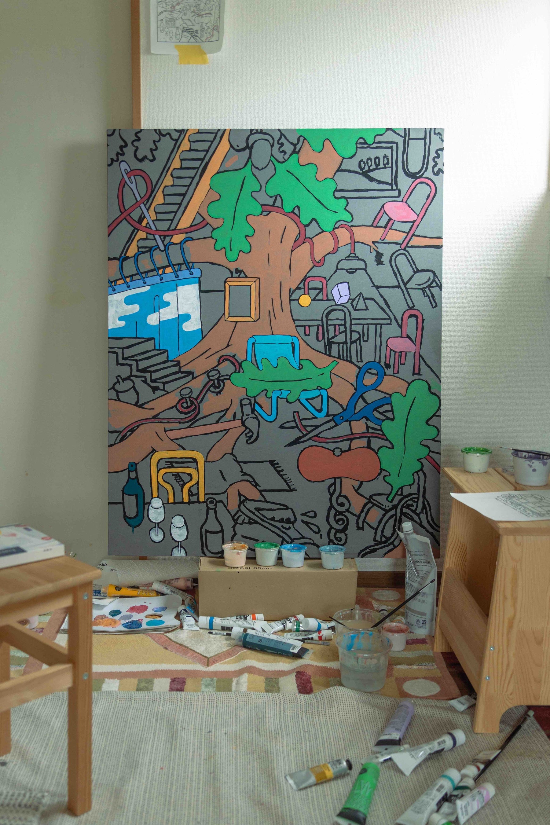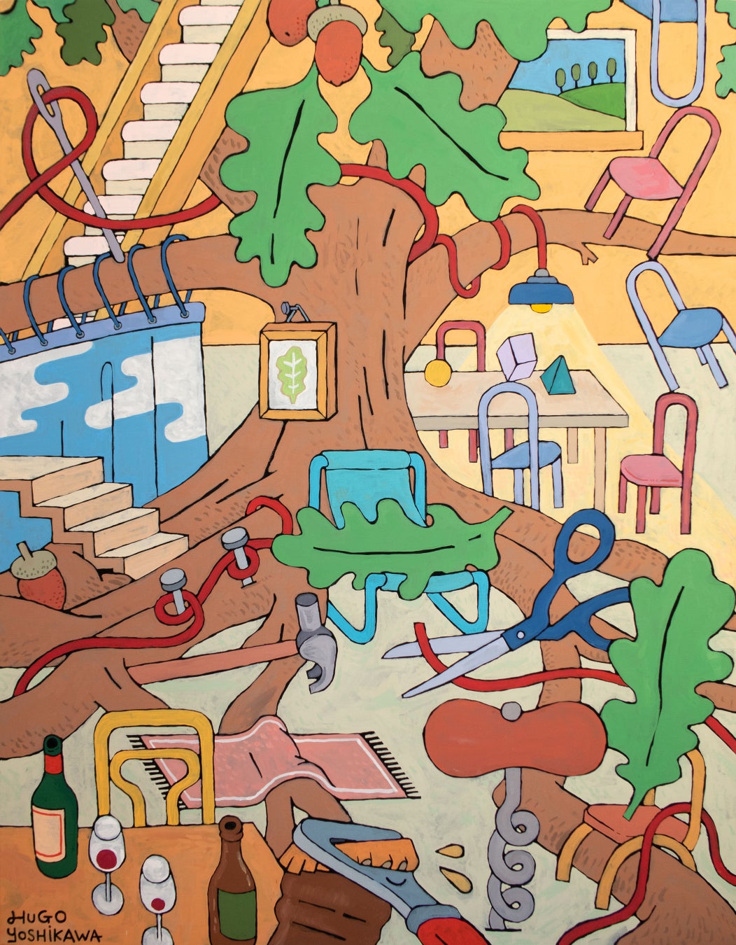 普段屋外にないものがさりげなく外の空間に存在していたり、大きな木や外でしか使用しないようなモノが家の中に配置されていたり、自然の中にモノが生まれ、そのモノたちがユーモラスに会話をしているかのうようです。 見れば見るほど不思議な世界の中に吸い込まれていきます。