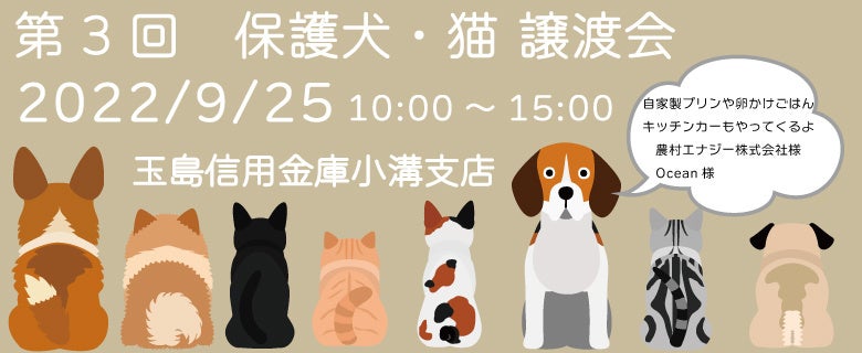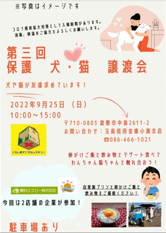 玉島信用金庫信用金庫(岡山県倉敷市)小溝支店では、倉敷市保健所ボランティア団体である、「倉敷アニマルレスキュー」様と協力し、2022年9月25日に保護犬・猫譲渡会を開催しました。沢山のご来場ありがとうございました。