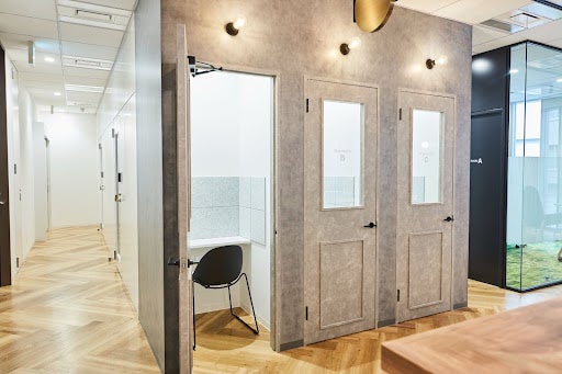 個人・法人共に使用していただくためフリーアドレス席(最大45席)、会議室(8人用×1室、4人用×1室)、テレブース(3室)、レンタルオフィス(4人用×2室)を用意しました。