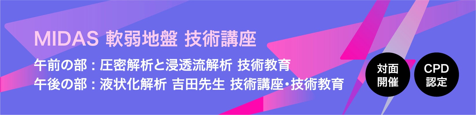 本技術講座では、日本国内に広く分布する軟弱地盤に関する現象やリスク評価の手法について、解析技術を学ぶ機会を提供いたします。午前の部では「圧密解析と浸透流解析」、午後の部では「液状化解析」の技術講座を実施し、特に液状化解析のセッションでは、関東学院大学および東北学院大学の吉田望先生をお招きしてご講演いただきます。