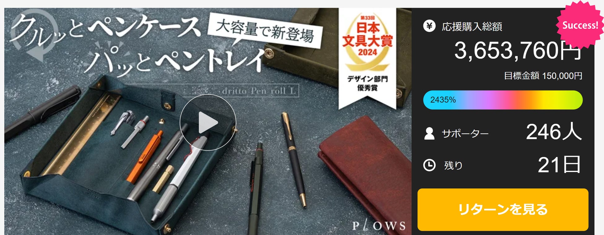 日本文具大賞2024 デザイン部門 優秀賞を受賞した「dritto Pen roll(ドリット ペン ロール)」が目標金額の2435%を達成いたしました。