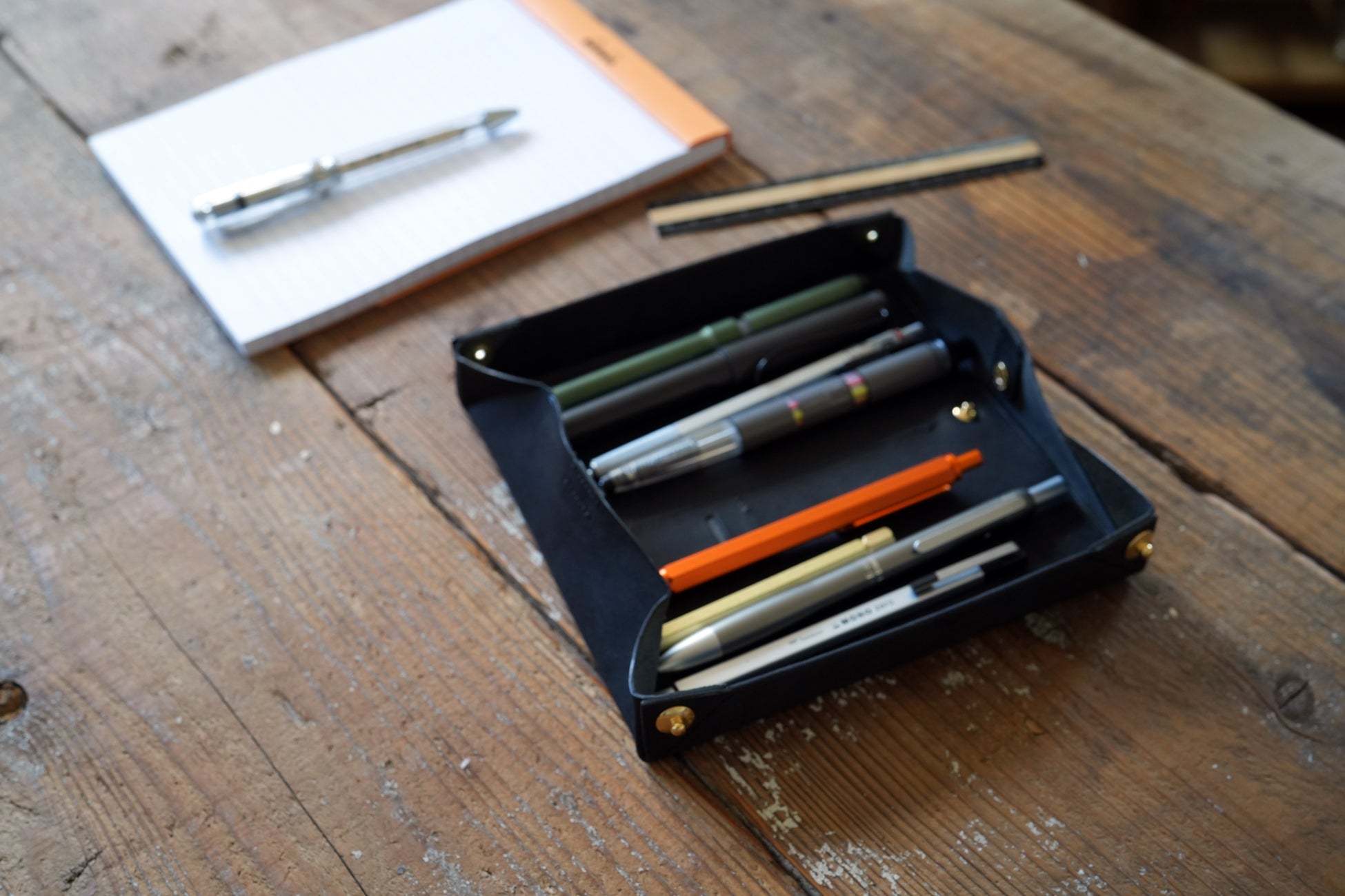 内装に外側と同じ革を使用する事により小さいペンやシャープペンの芯などの小物を収納する事が可能になりました。