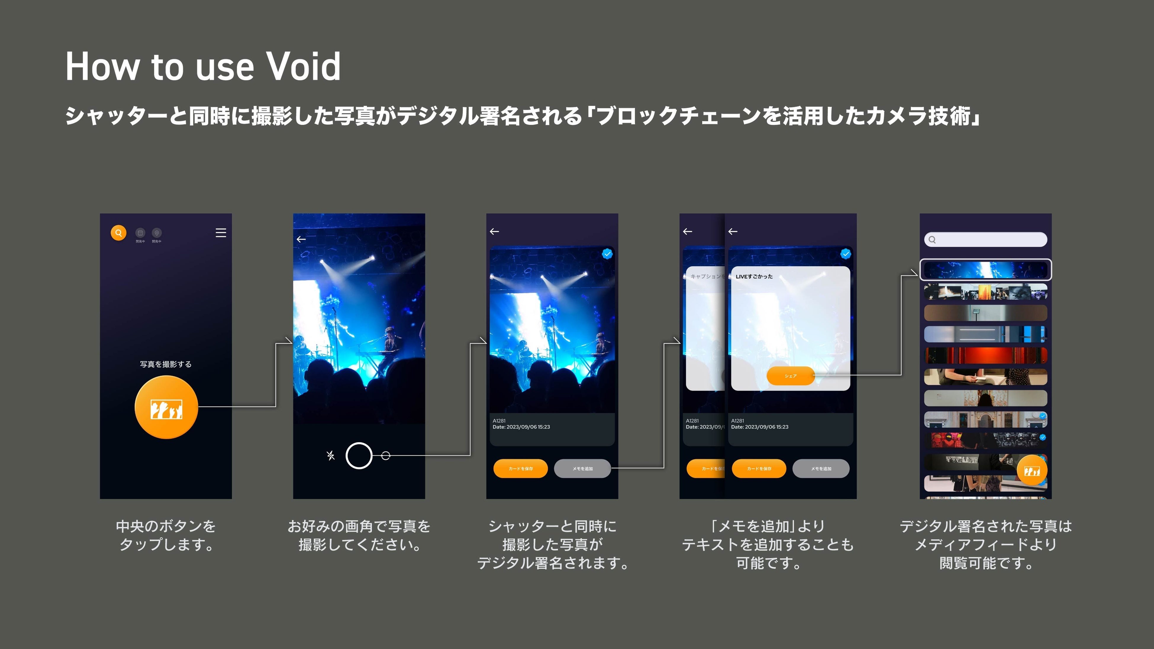 そこで、撮影した写真がシャッターと同時にデジタル署名(独自開発)される「ブロックチェーンを活用したカメラ技術」を開発しました。