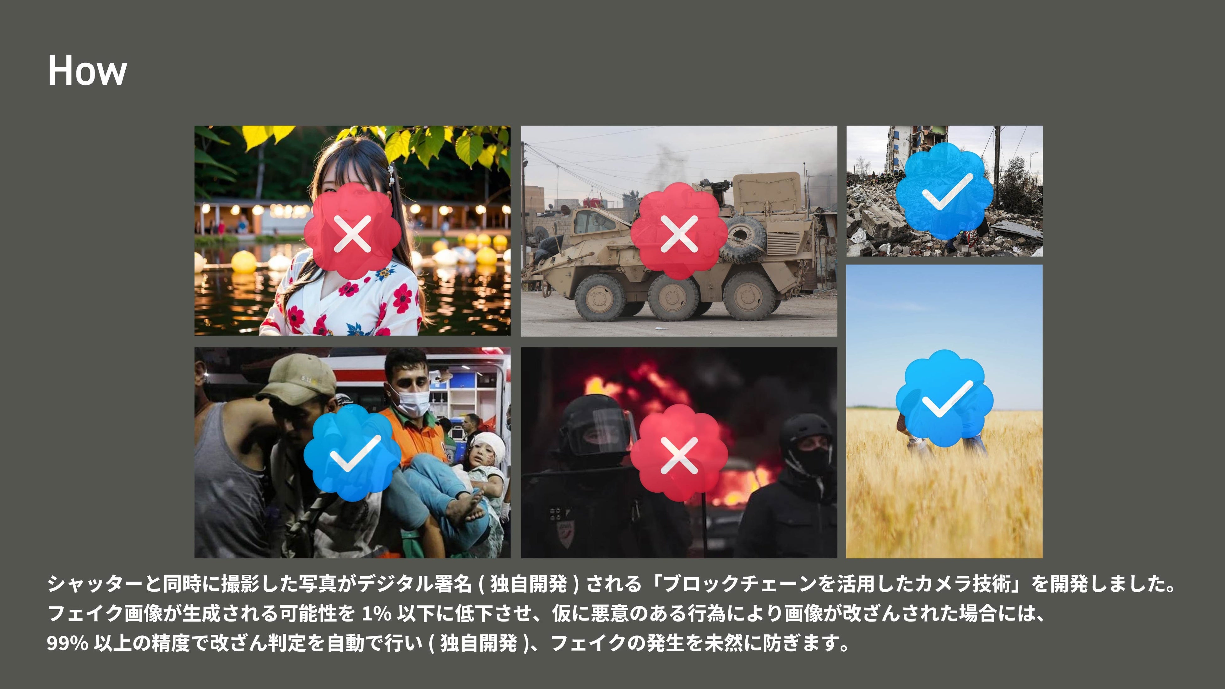 ブロックチェーンを活用した独自システム(特許申請中)により実現される、フェイク画像の無いメディア