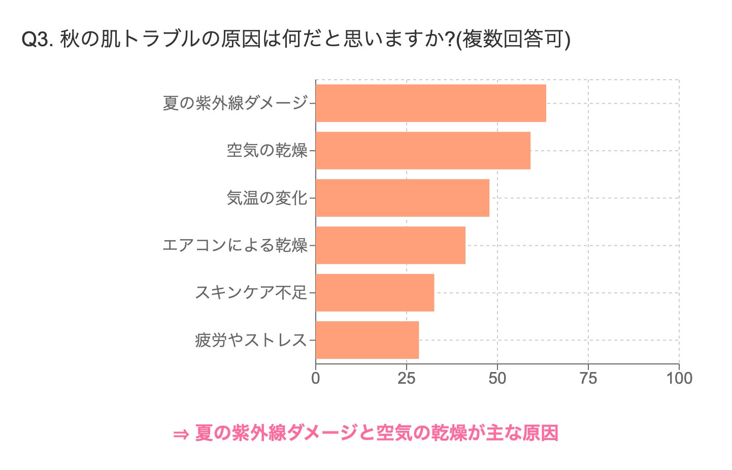 その結果、約63%の方が「夏の紫外線ダメージの蓄積」、約59%が「空気の乾燥」を原因として挙げており、夏から秋への季節の移り変わりが肌に大きな影響を与えていることが分かりました。