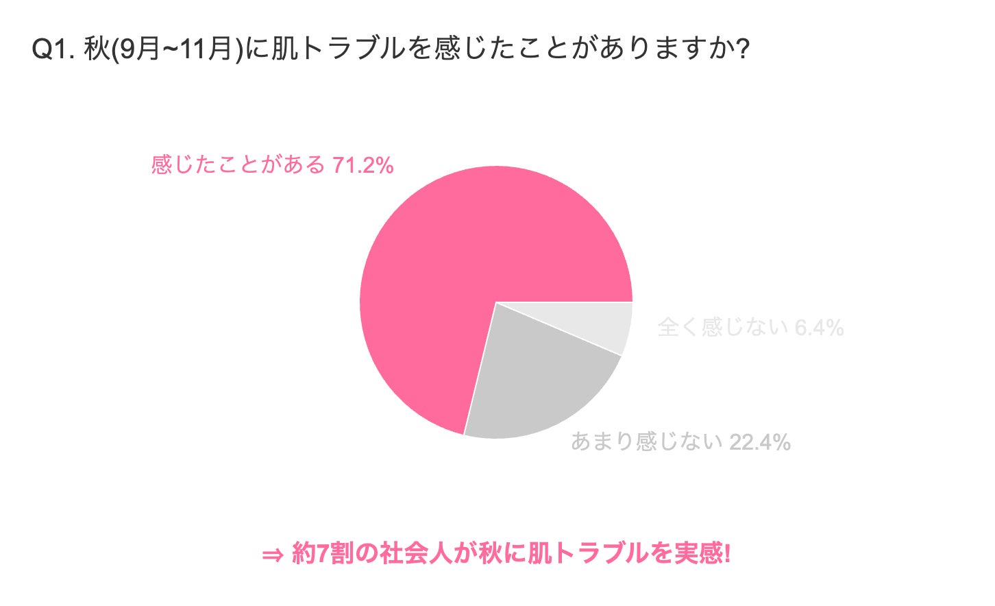 その結果、約71%の方が秋に肌トラブルを感じたことがあると回答し、多くの社会人が季節の変わり目の肌トラブルに悩んでいることが分かりました。