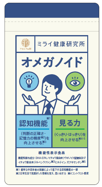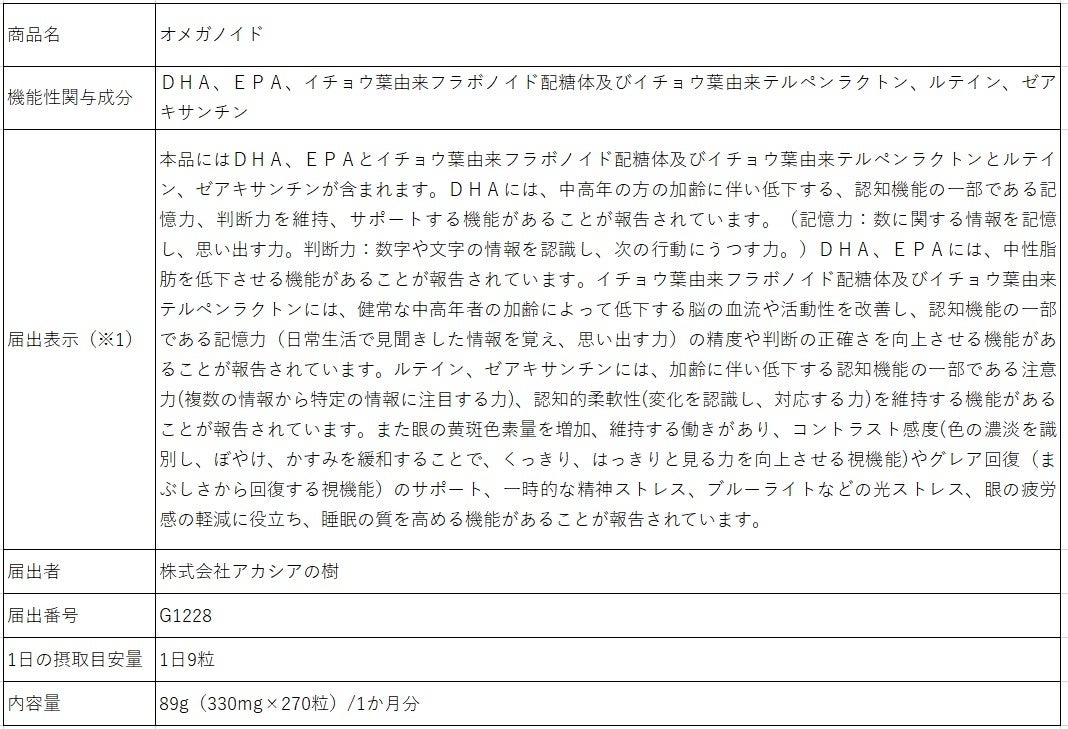 株式会社アカシアの樹(広島県廿日市市)が「機能性表示食品制度」に基づき届出を行なった、コントラスト感度(色の濃淡を識別し、ぼやけ、かすみを緩和することで、くっきり、はっきりと見る力を向上させる視機能)のサポートと認知機能の一部である記憶力(日常生活で見聞きした情報を覚え、思い出す力)の精度や判断の正確さを向上させる機能だけでなく、その他4つの機能(中性脂肪の低下、一時的な精神ストレス・ブルーライトなどの光ストレス、眼の疲労感、睡眠の質を高める)を持ち、合計6つの機能性をもつ機能性表示食品「オメガノイド」が消費者庁に受理されましたのでお知らせいたします。