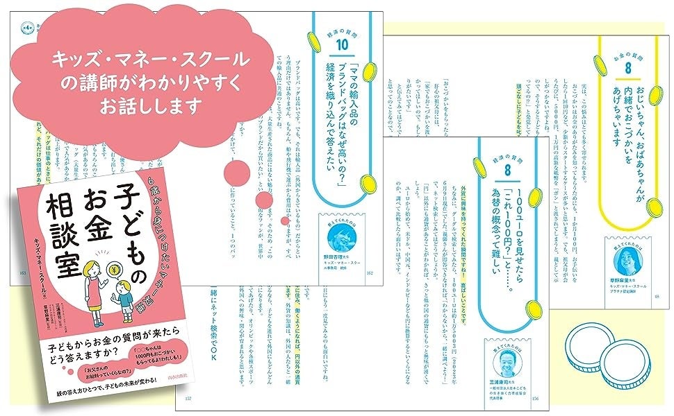 当協会代表理事・三浦康司が、我が子に実践していた年利12%の「パパ銀行」やおこづかいを米ドルで渡すなどの金銭教育。それをもとに親子で学ぶ「キッズ・マネー・スクール」が2014年からスタートしました。スクールに参加した全国の子育て中の親から「具体的にどのように教えたら良いかよくわからない」との悩みが寄せられ、その声に応えるべく、この書籍では成長過程でぶつかる“お金の悩み”をケーススタディごとにキッズ・マネー・スクール認定講師が解答しており、お子様を一生お金に困らない人に育てるための問答集となっています。