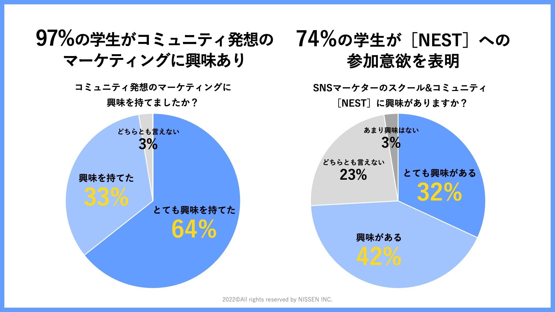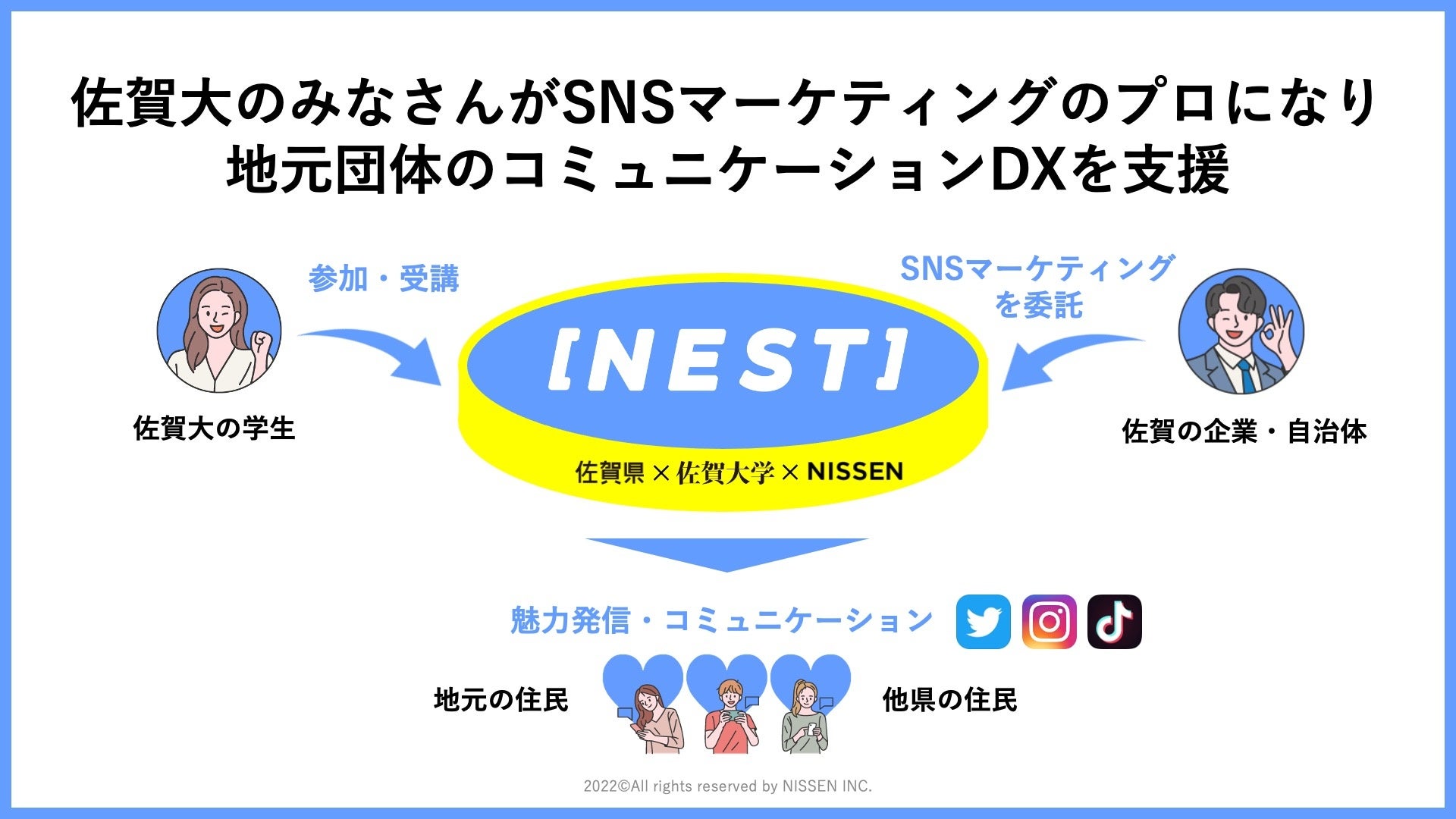 後半には、当社が実証実験の準備を進めている、学生インターンを登用した地域のコミュニケーションDX支援事業[NEST]を紹介し、学生に参加を呼びかけました。[NEST]はNative Engagement Studioの略称です。デジタルネイティブ × 地元ネイティブである地域の学生を対象に、SNSマーケティングのスクールを開講し、そこでスキルを身につけた学生をインターンとして地域内の企業や自治体に派遣、マーケティングやPRを支援いたします。今回の講義で[NEST]の第0期生(β版の受講生)の募集を行いました。