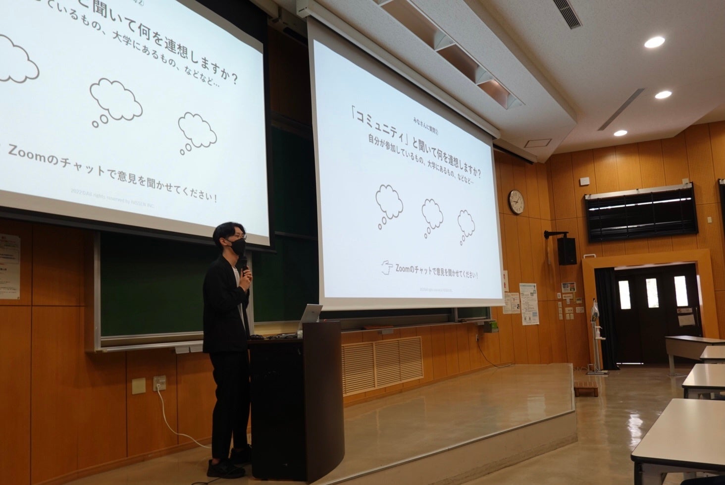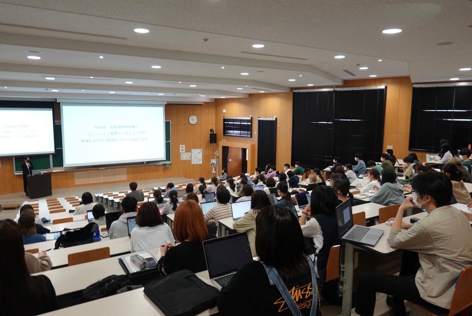 「マーケティング論」の講義は学部1年生の科目であり、当日は約120名の学生に参加いただきました。昨今の市場環境の変化、生活者の変化を踏まえ、「大衆」でも「個人」でもなく、「コミュニティ(=共通の思考や態度があり、互いにつながっている集団)」との共創から市場創造することで、資本規模に頼らない自立したサステナブルな地域創生が叶えられるという当社の考えを伝え、佐賀県におけるコミュニティ発想での市場創造アイデアを提示いたしました。