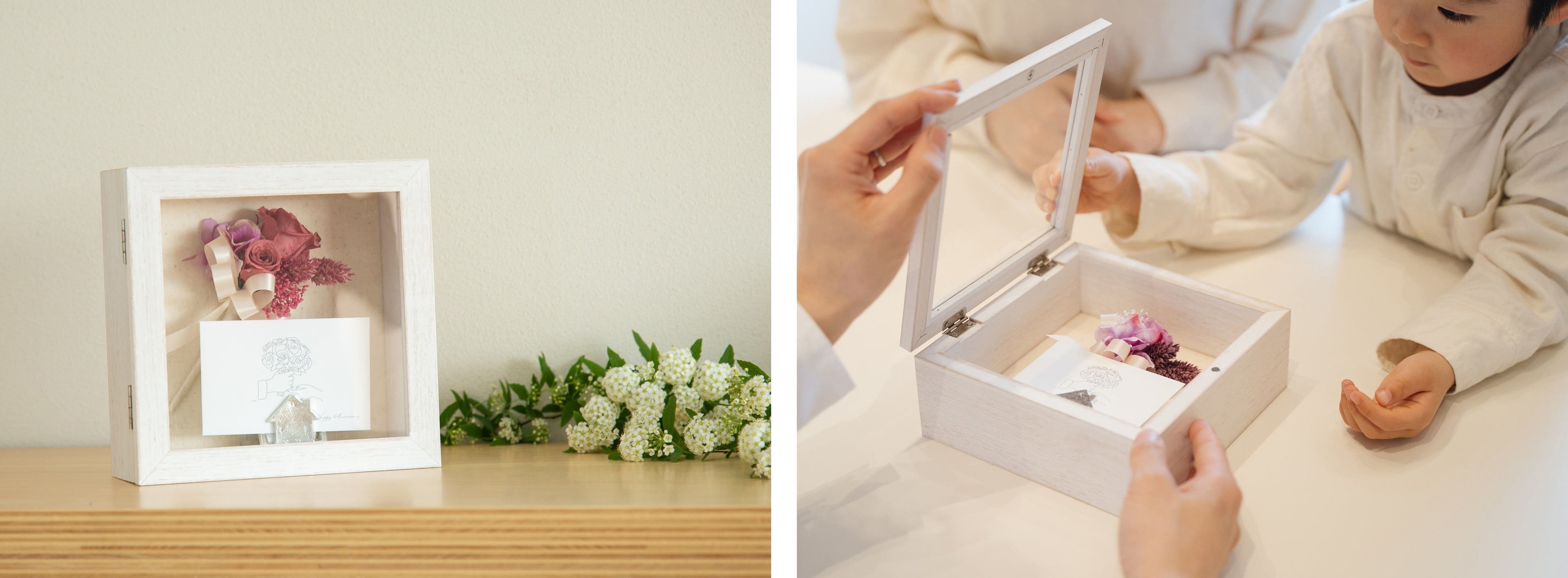 誓いの刻印を施した錫板、10年後のご家族に向けたメッセージ、ブートニアを入れて、自宅に飾れるメモリアルボックスを作ります。