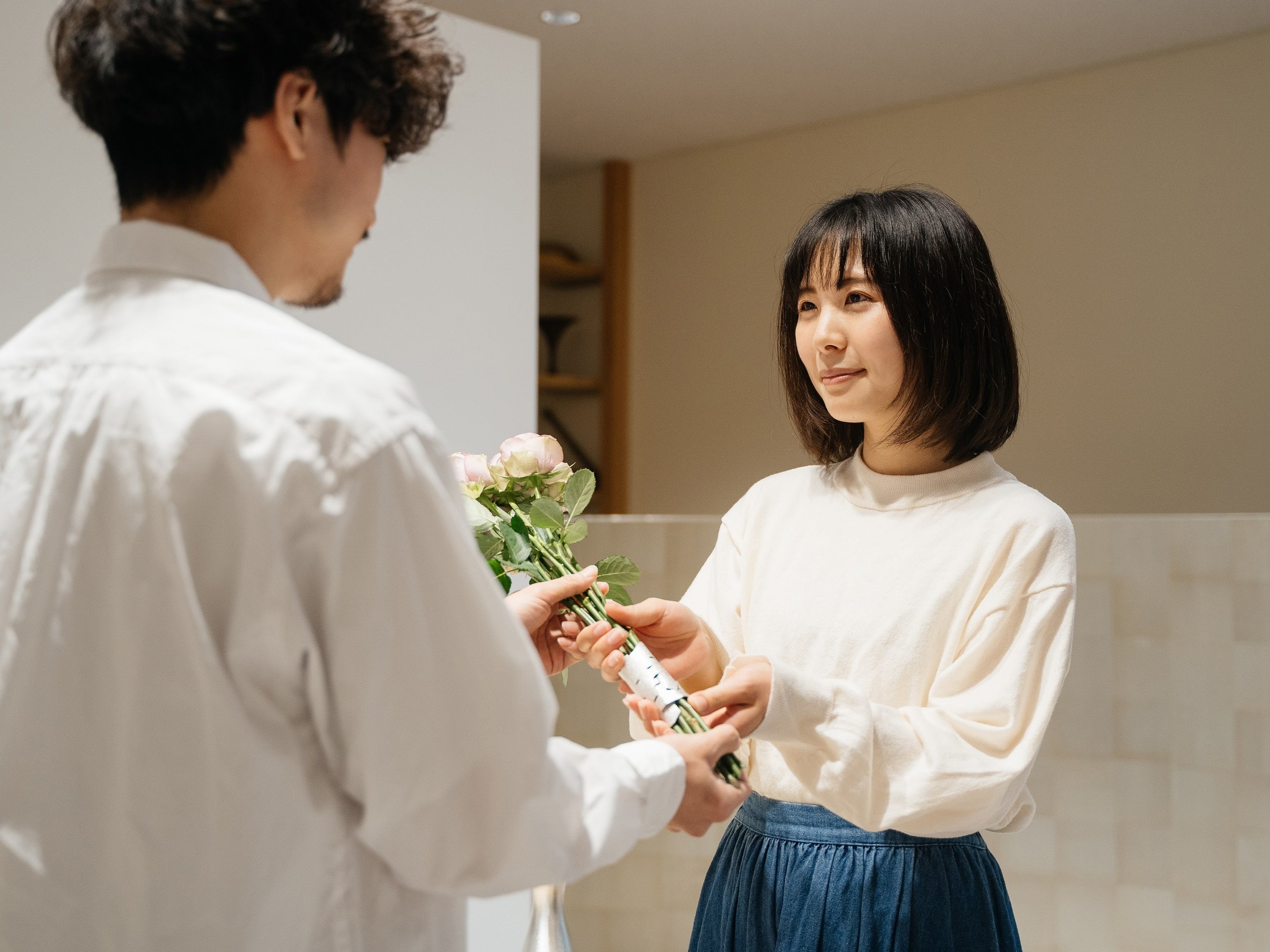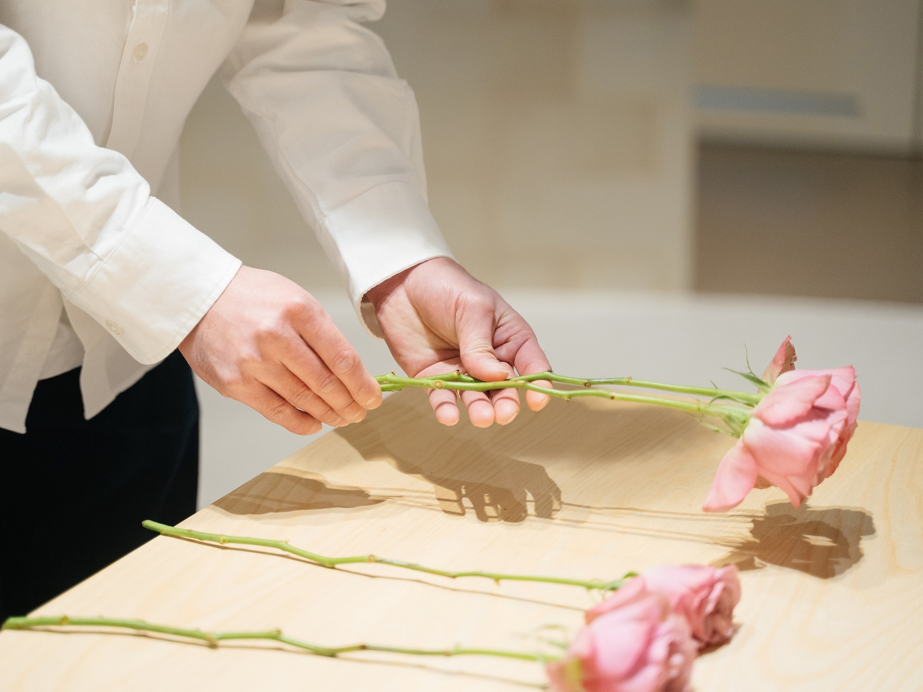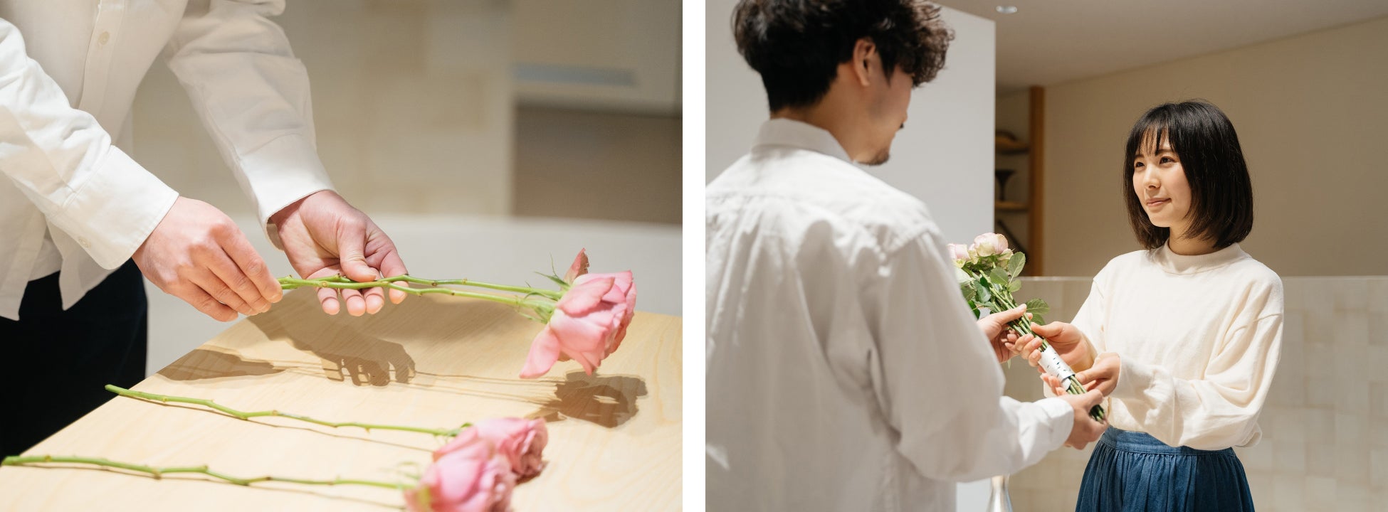 10年分の想いを込めて1輪ずつローズを手に取り、錫の花留めで束ねたブーケをパートナーに贈ります。