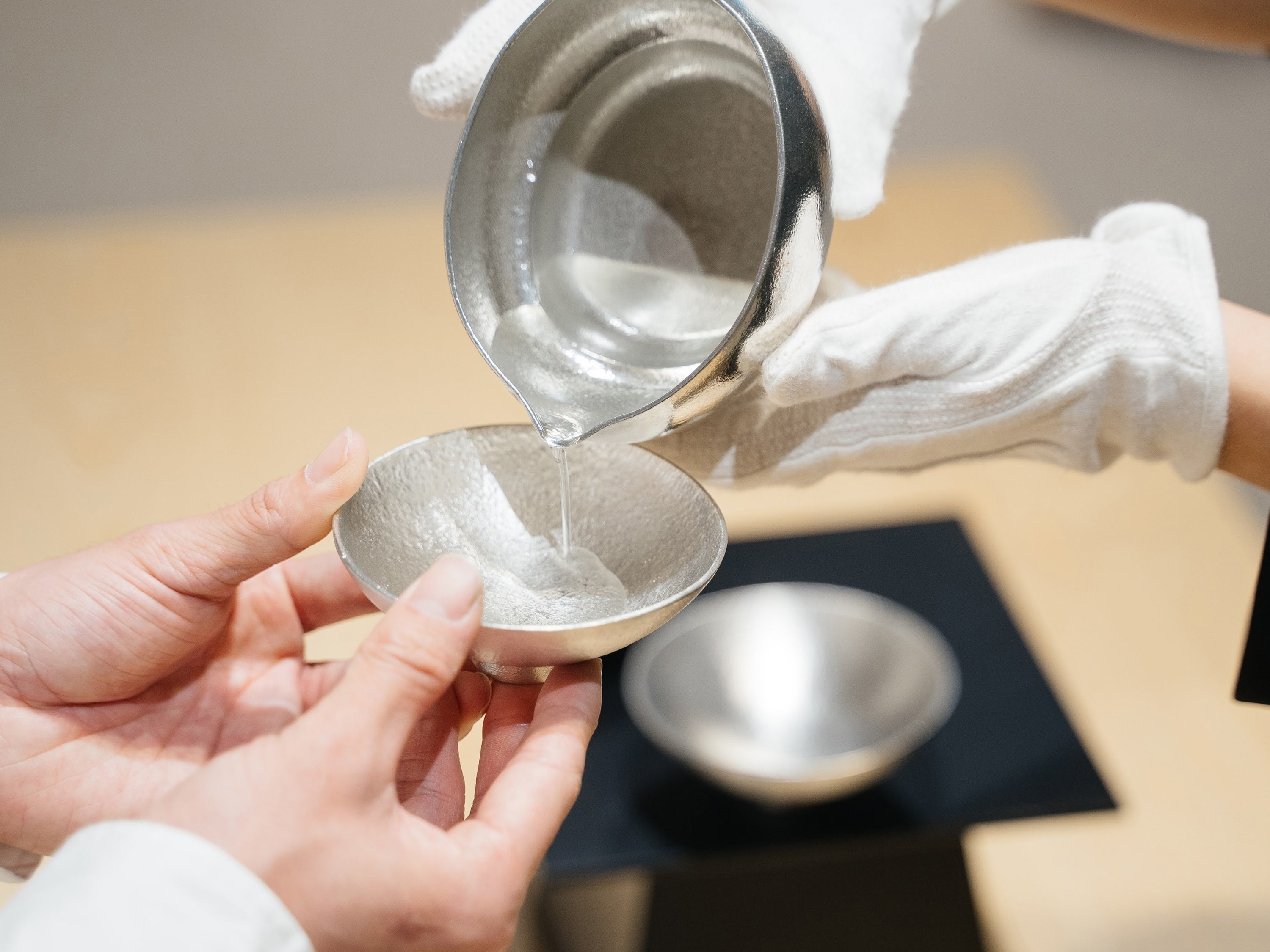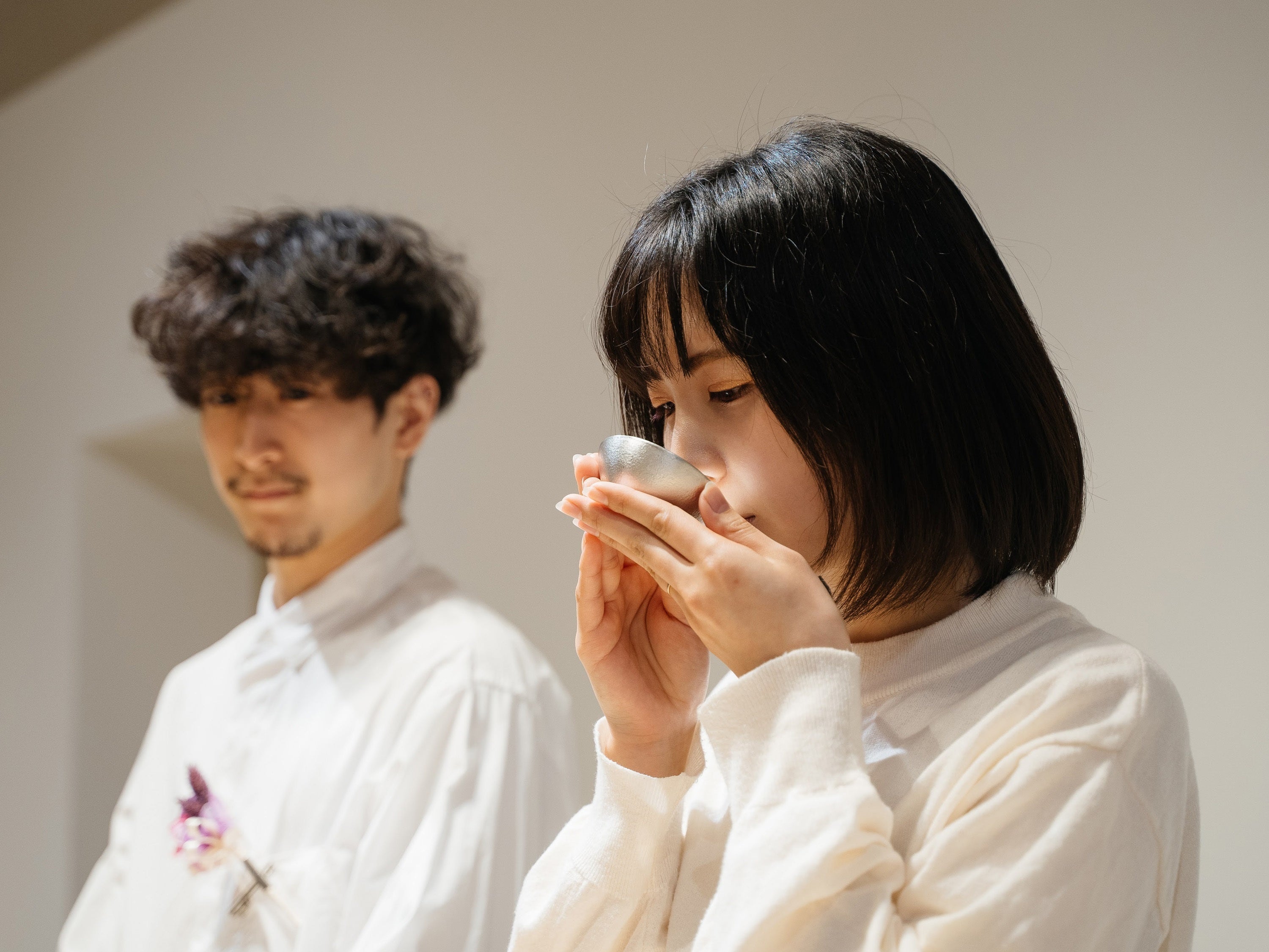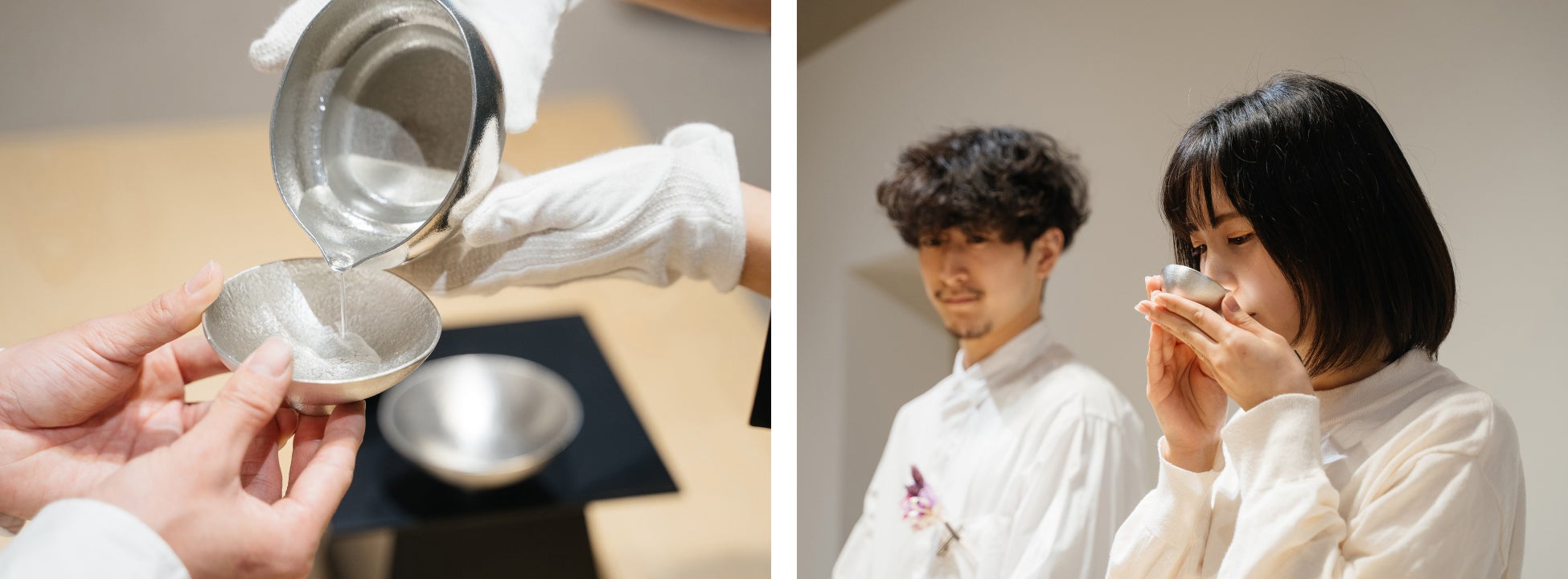 錫100%製の小・中・大の盃をおふたりで交わす三三九度。3つの盃には、「過去:共に歩んだ10年」「現在」「未来」という意味が込められています。