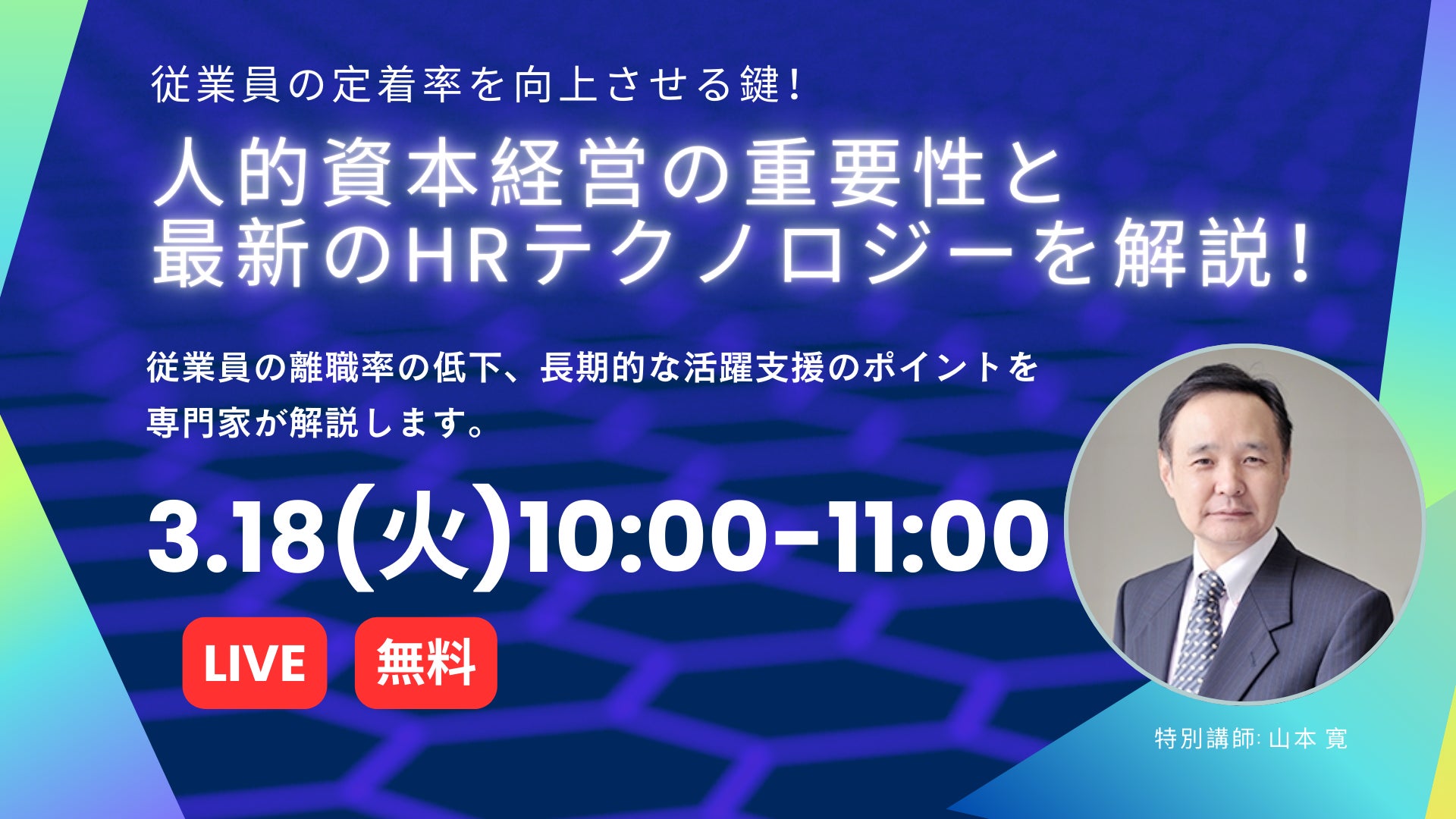 AME&Company株式会社(代表取締役:吉村章央)は、当社アドバイザーの山本寛教授(青山学院大学 経営学部 経営学科教授)による、無料オンラインセミナー『人的資本経営の重要性と最新のHRテクノロジー』を3月18日(火)10時より開催いたします。