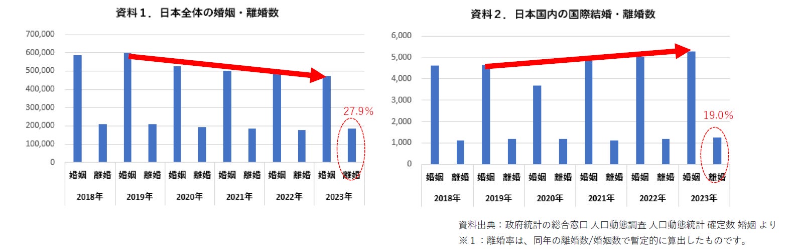 日本全体の婚姻数が年々減少しているのに対して、国際結婚の数は2022年度にコロナ禍の影響で一時減少したものの、総じて増加傾向にあります。また離婚率(※1)については、日本全体で27.9%に対して、国際結婚では19.0%と低いことがわかります。[2023年度の国際結婚の相手国(および地域)にて、男性で一番多いのは1位中国、2位米国、3位ブラジル、4位フィリピン。女性では、1位中国、2位フィリピン、3位ブラジル、4位米国]