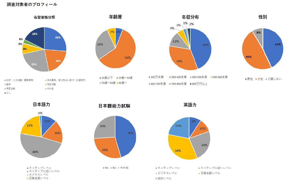 なお調査対象の外国人材は、日本国籍取得者を含む身分地位に基づく在留資格、技術・人文知識・国際業務、留学、特定活動など約8割が高度外国人材、もしくはその予備軍が中心となります。