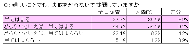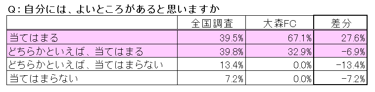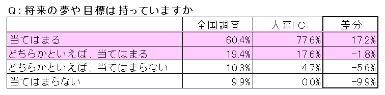 「当てはまる」「どちらかといえば、当てはまる」と回答したのは、全国調査79.3%に対し、大森FCは100%