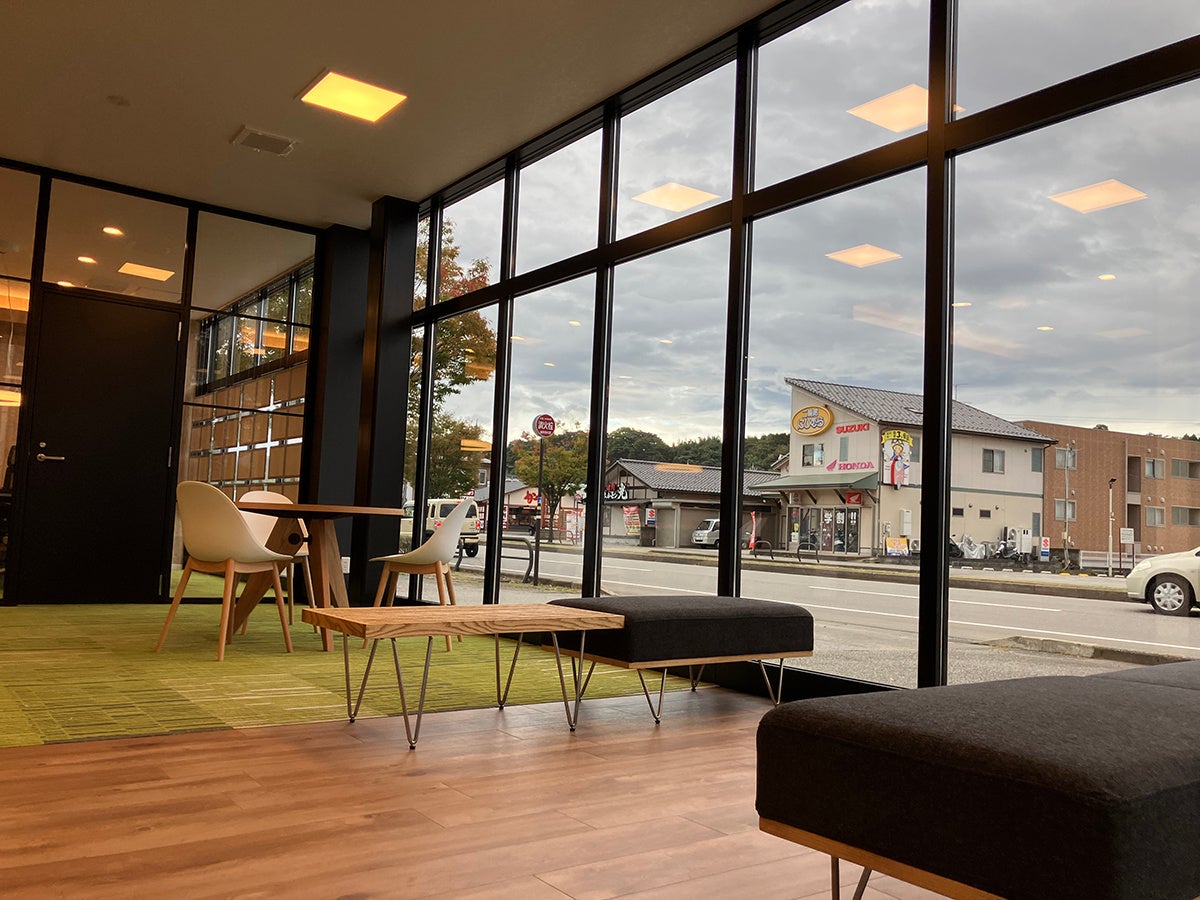 一面ガラス張りのワンフロアで開放感があり、気軽にご来店いただける店舗です。金沢市東部の住まいの窓口として、住宅や不動産をお考えの方にワンストップでお力添えいたします。