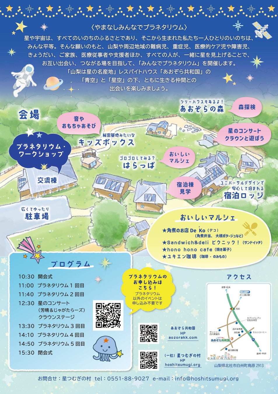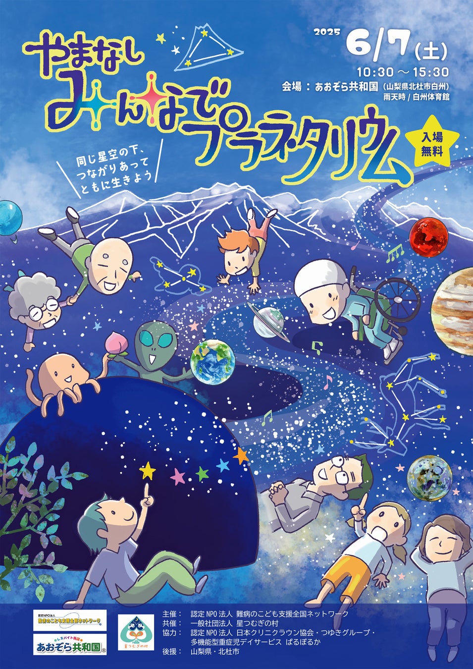私たちはこれまで、病院や施設、被災地、学校など、さまざまな場所に「出張プラネタリウム」を届けてきました。今回のイベントは、特に山梨県内の皆さまが一堂に会し、「星の力」を実感できる貴重な機会です。ぜひ多くの方にご参加いただき、同じ星空の下で生きる存在であることを実感してもらう機会としたいと思っています。