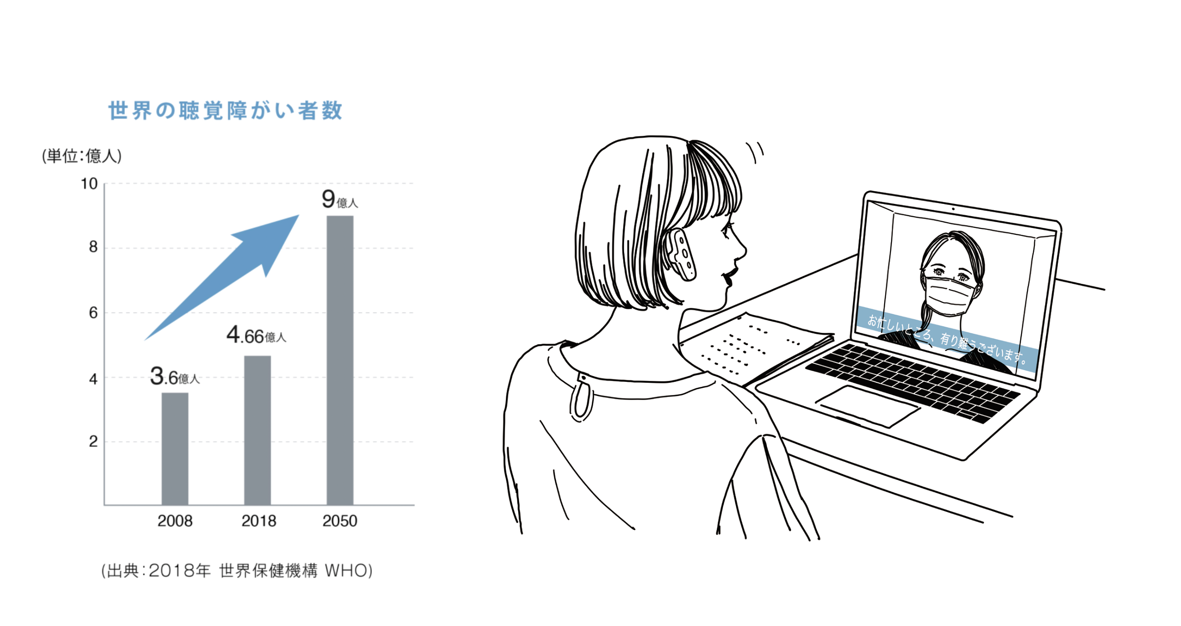 2050年には世界の聴覚障がい者が9億人を越えると言われ、社会問題となっています。