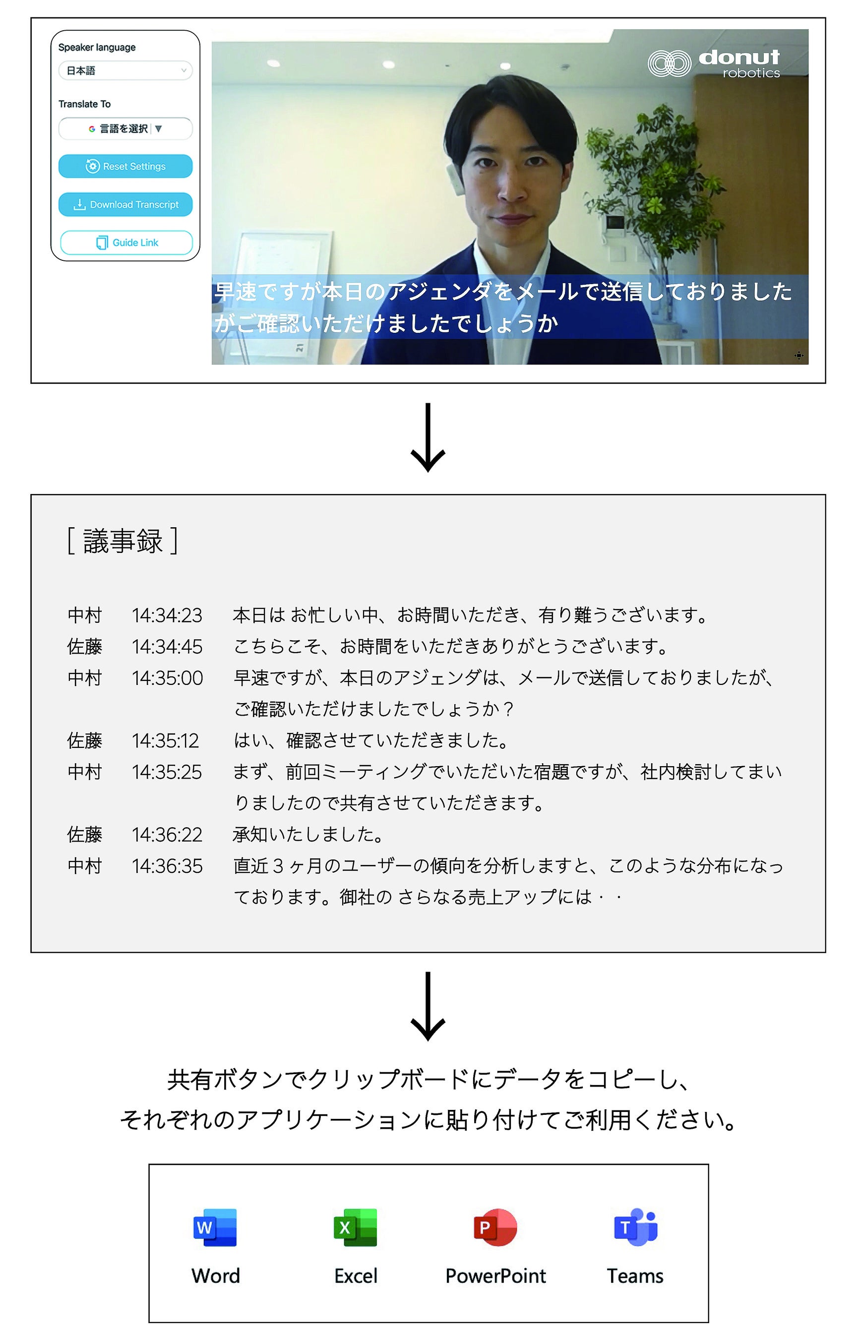 「将来、オンライン会議に求める機能」の1位は、議事録作成です。「clip EAR」を購入いただいた お客様には、ドーナッツ ロボティクス社の議事録作成、字幕表示、翻訳のwebサービスが使用できるようになります。