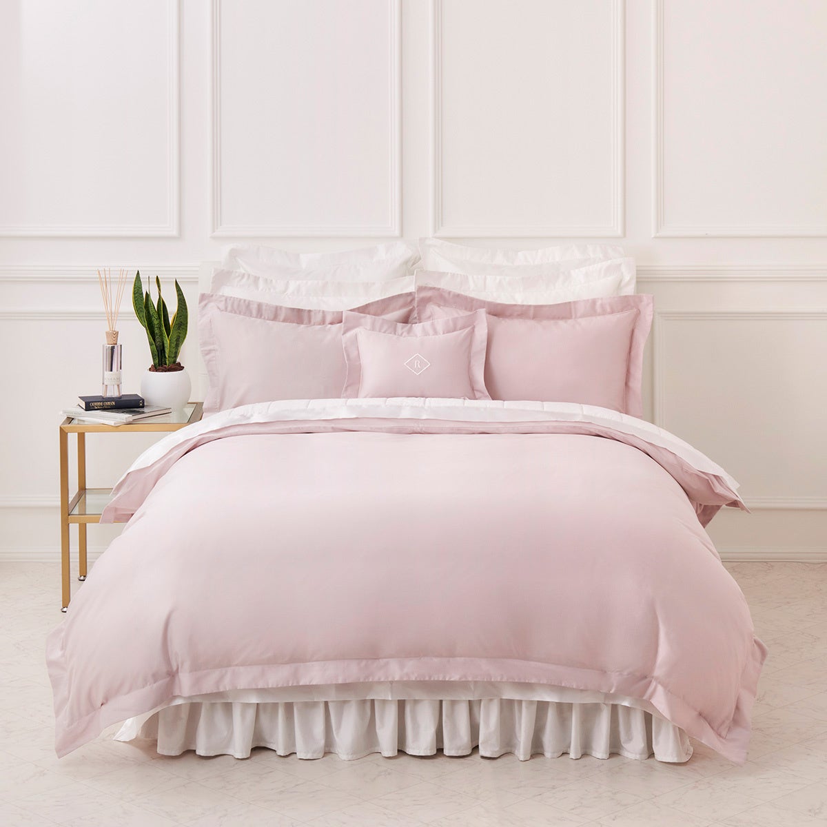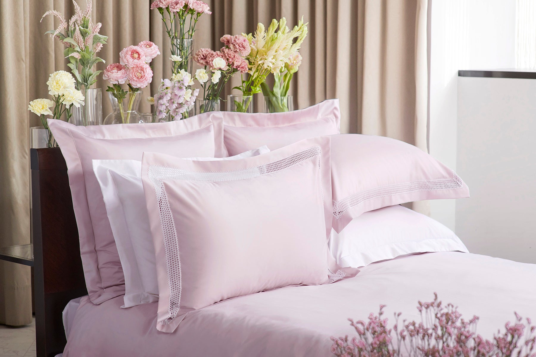 400TC コットンサテンシリーズ ローズクォーツと400TC ハニカムのピローケースの組み合わせは、春らしいカラーでこれからの時季にとても人気のコーディネートです。ローズクォーツの大人の落ち着いたピンク、そして繊細な透かし編みのレースがたおやかな印象をもたらすピローケースが寝室を華やかに彩ります。