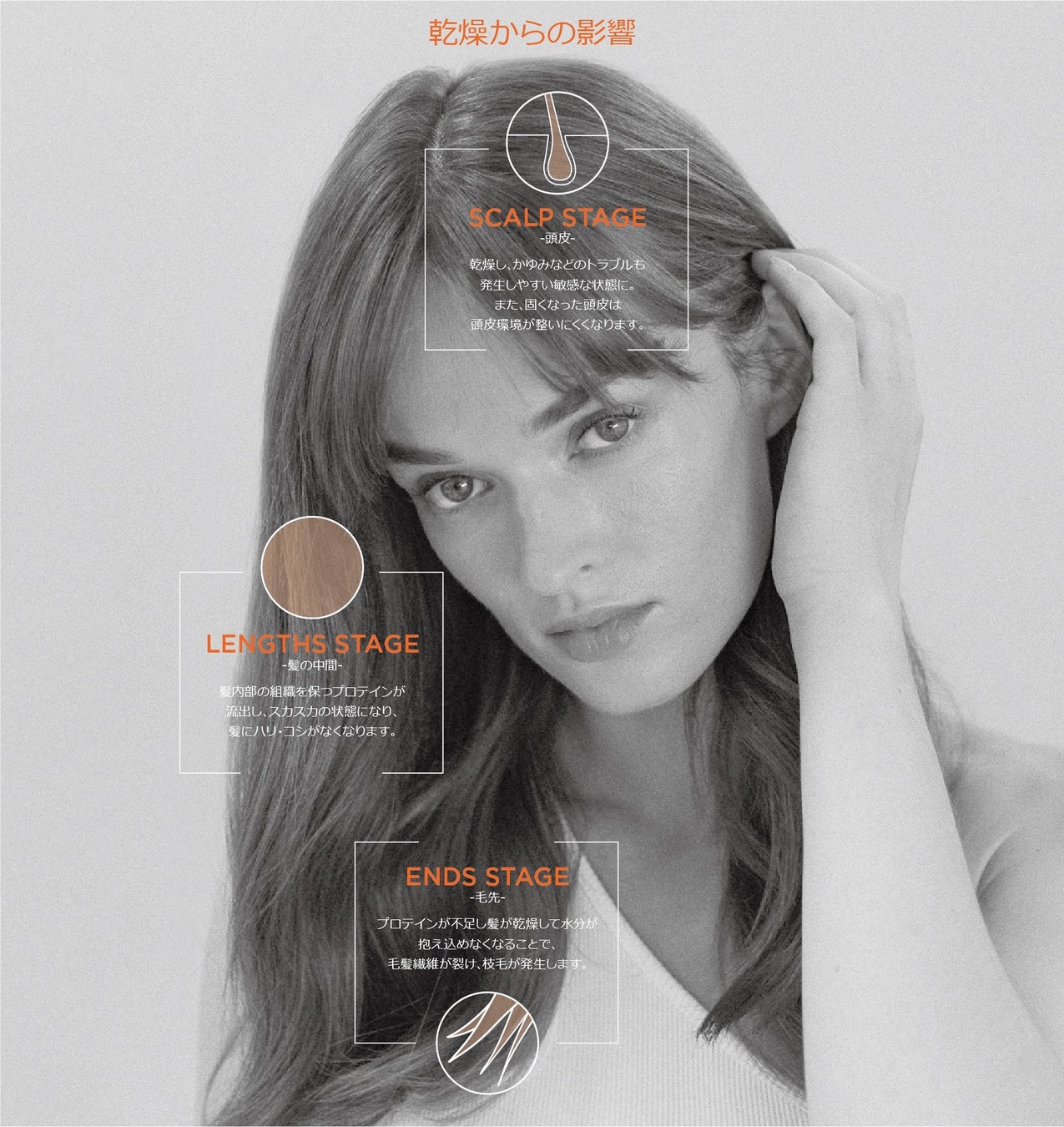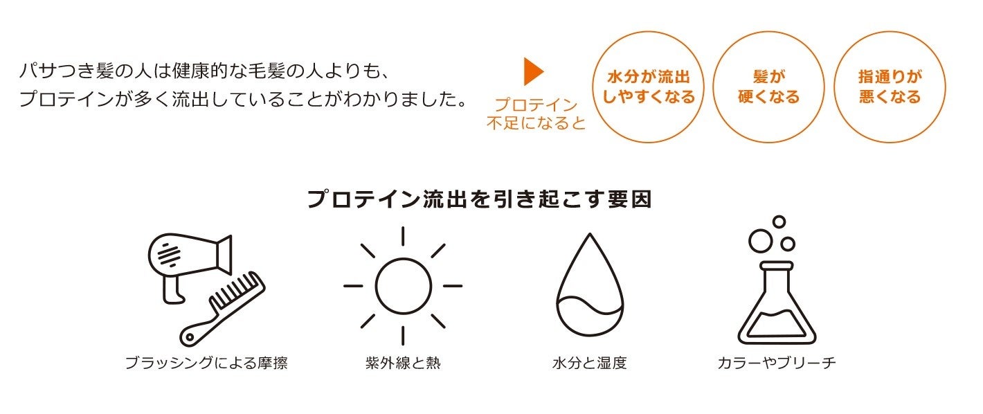 髪の構成成分の約80%を占めるプロテインは、毎日のドライヤーやアイロン、カラーリングやパーマなどのケミカルダメージはもちろん、紫外線や湿度などの環境要因でも流出。また、このプロテイン不足によって引き起こるパサつきは、頭皮、髪の中間、毛先に影響を与えます。