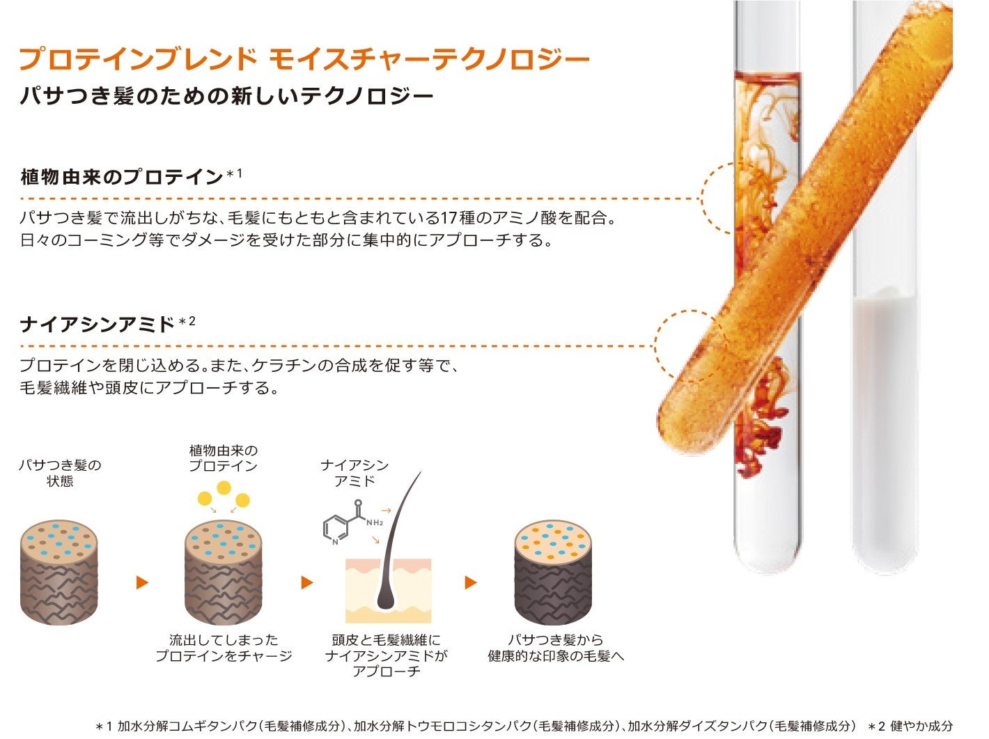 *¹ 加水分解コムギタンパク(毛髪補修成分)、加水分解トウモロコシタンパク(毛髪補修成分)、加水分解ダイズタンパク(毛髪補修成分) *² 健やか成分