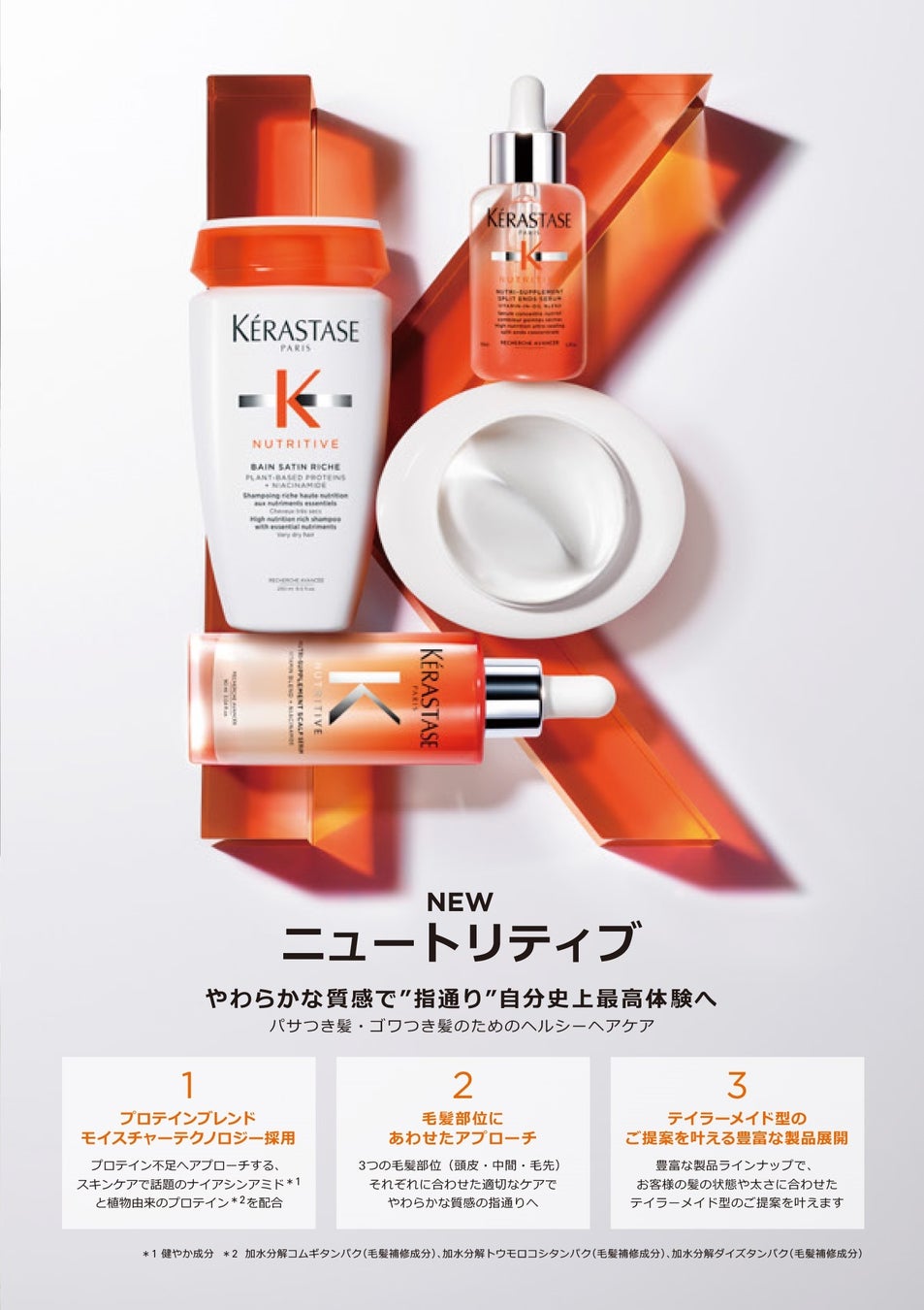サイエンスとラグジュアリーを融合させた先進のケアによりヘルシーな印象でリッチな髪へ導く先駆的存在です。7年ぶりのリニューアルをはたすニュートリティブ シリーズに、硬化した髪にやわらかさを取り戻す植物由来のプロテイン*¹とスキンケアの分野で話題のナイアシンアミド* ²を配合した技術を採用しました。