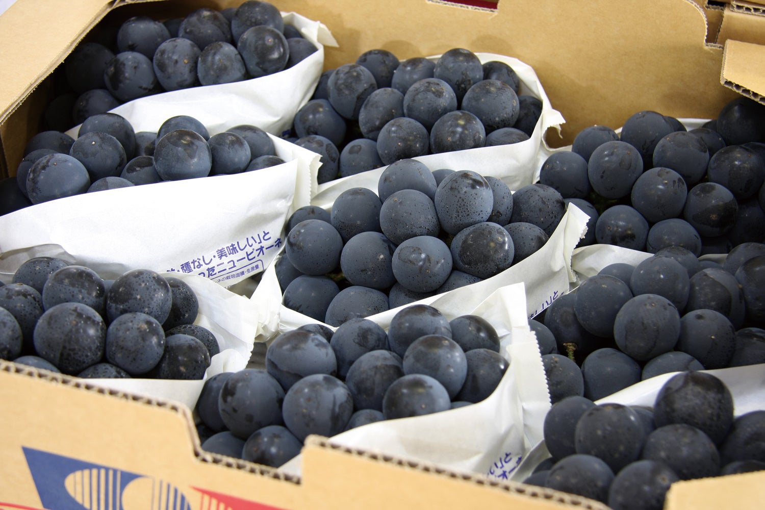 大福に使う果物は、甘味だけではなく酸味がなければ、餅や白餡との相性がよくありません。ぶどう大福には岡山県産の「ニューピオーネ」、広島県産の「ピオーネ」を使用しています。たわわに実った果実は、職人が手作業で一粒ずつ丁寧に房から外し、大福へ生まれ変わります。