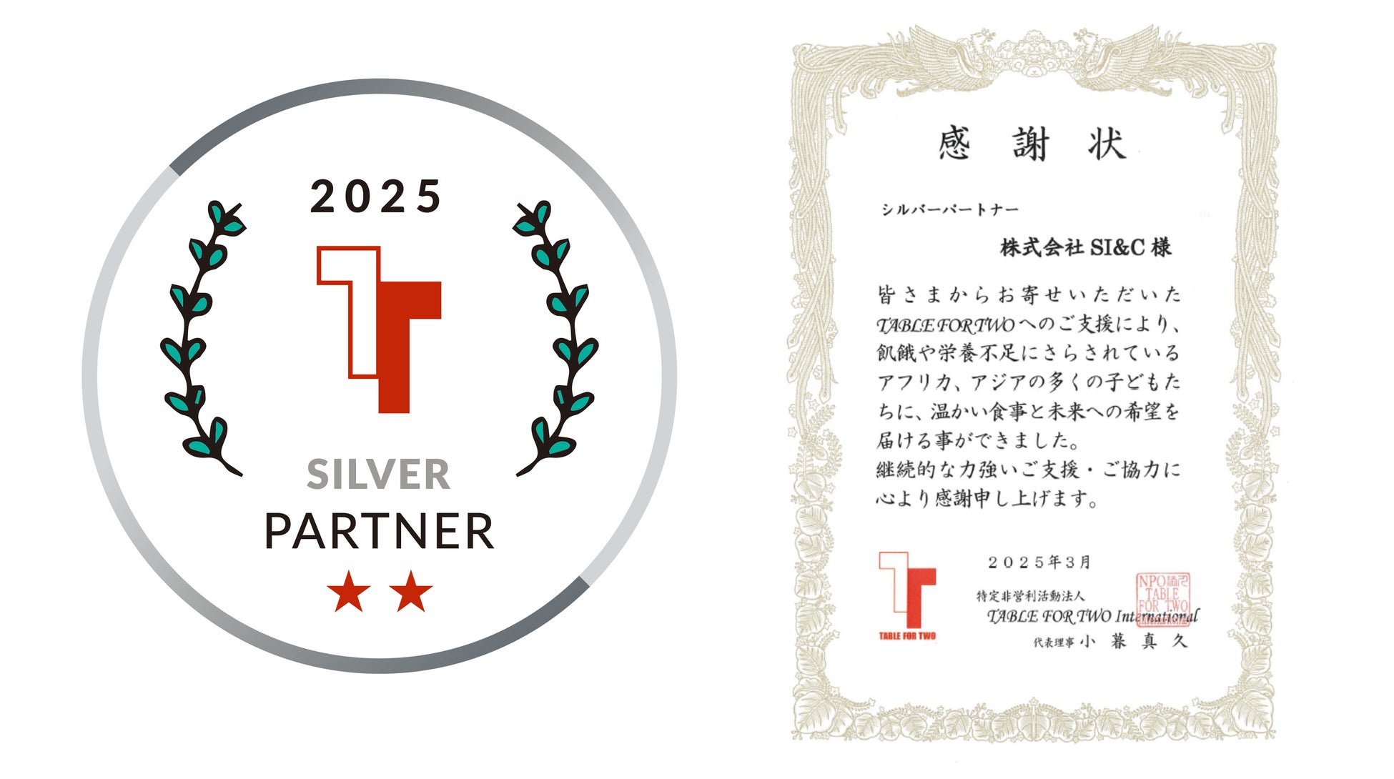 株式会社SI&C(本社︓東京都港区、代表取締役社長︓岩澤 俊典、以下SI&C)は、サステナビリティ活動の一環として支援している 特定非営利活動法人 TABLE FOR TWO International(以下、TFT)より、2024年の支援に対して「シルバーパートナー」として認定いただき、感謝状を受領いたしましたのでご報告いたします。
